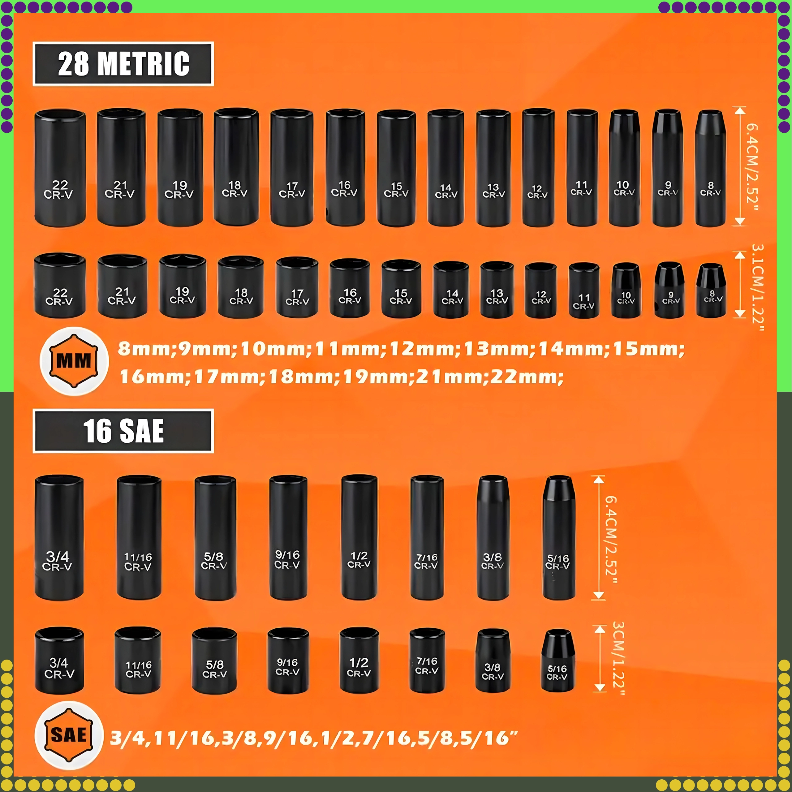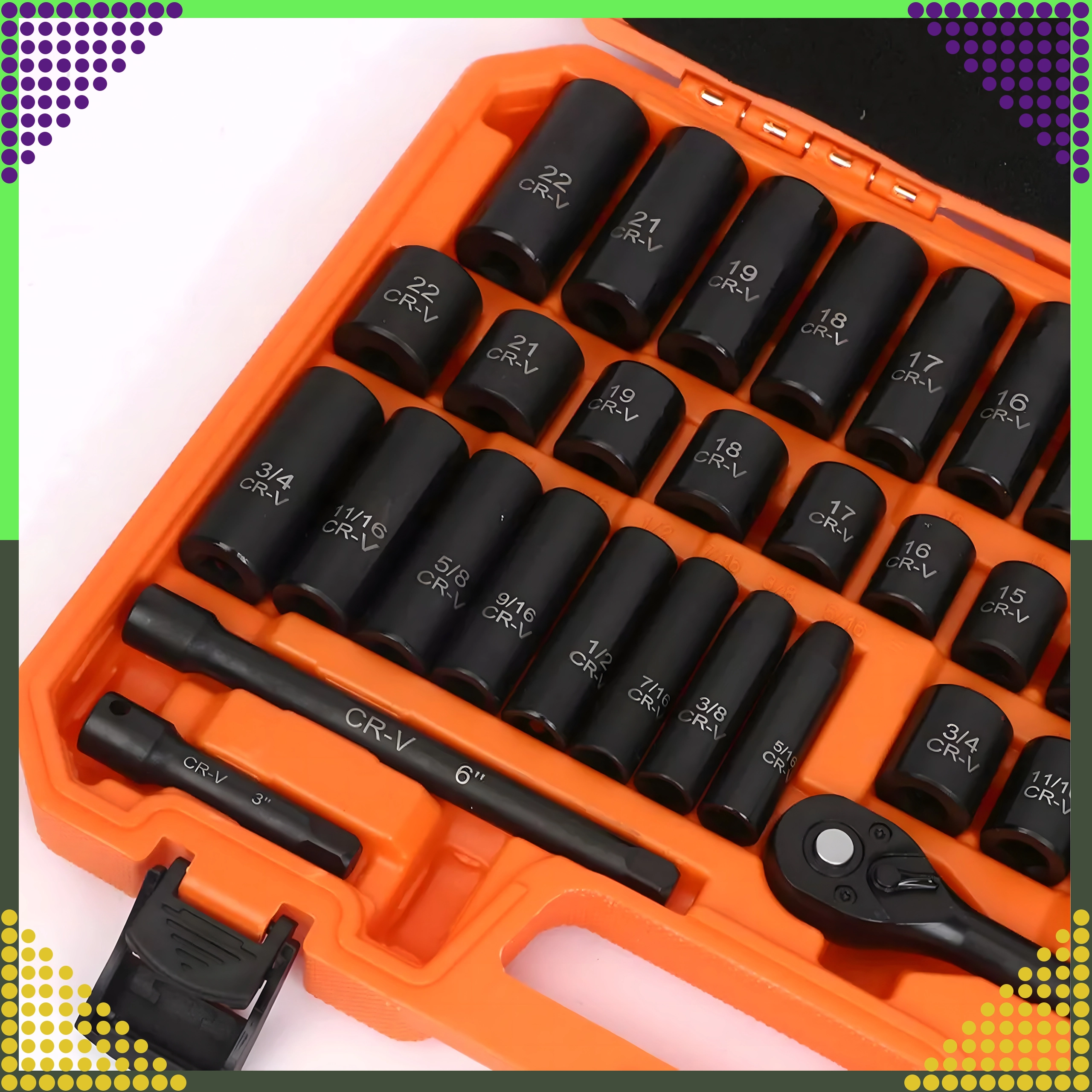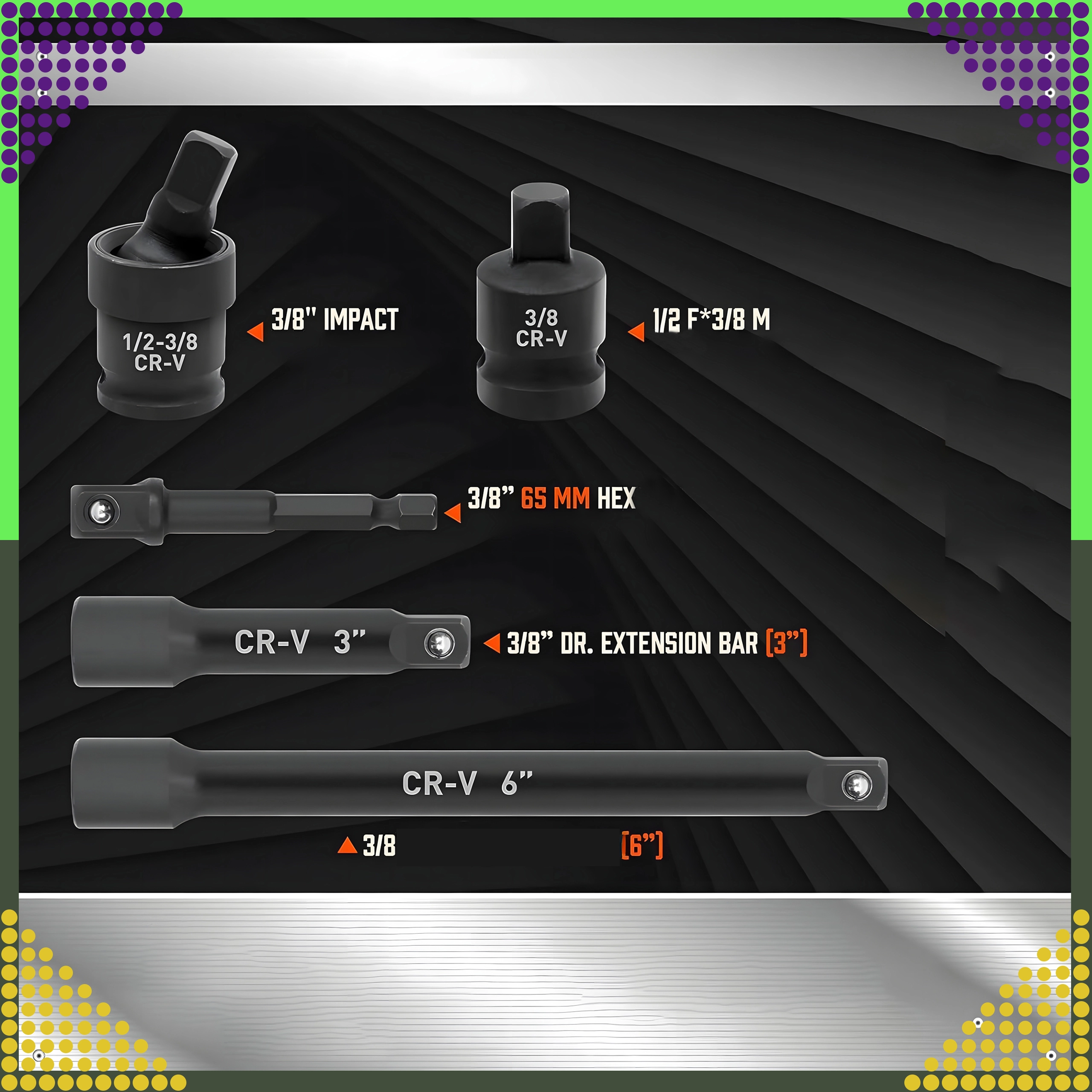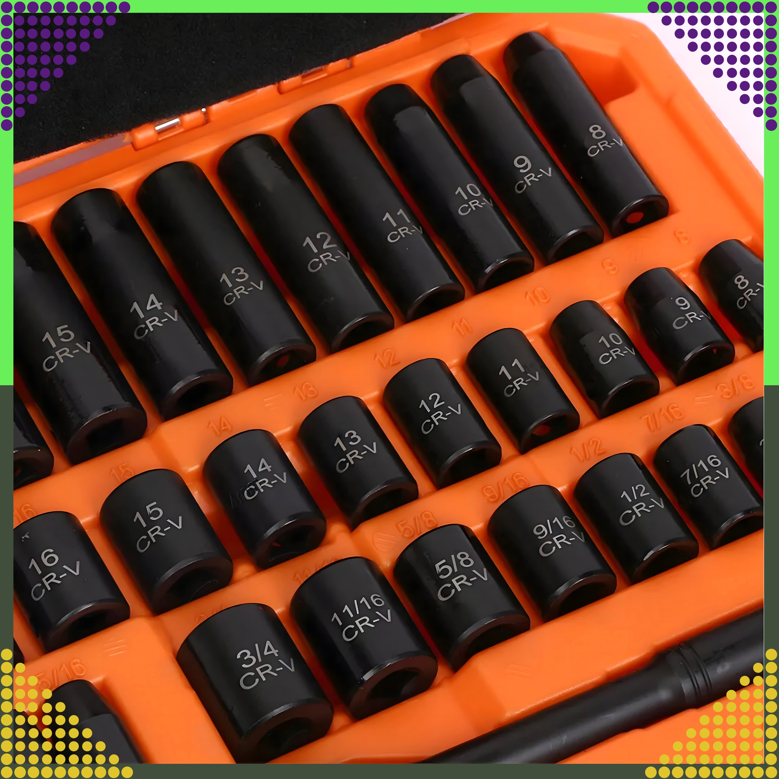 Ce jeu universel de douilles à chocs 3/8'' est conçu pour les mécaniciens, réparateurs et utilisateurs exigeants. Il combine des dimensions métriques et SAE, ce qui permet d’intervenir facilement sur des machines européennes comme américaines. Le profil 6 pans assure un contact ferme avec la vis et réduit le risque d’arrondir les arêtes.