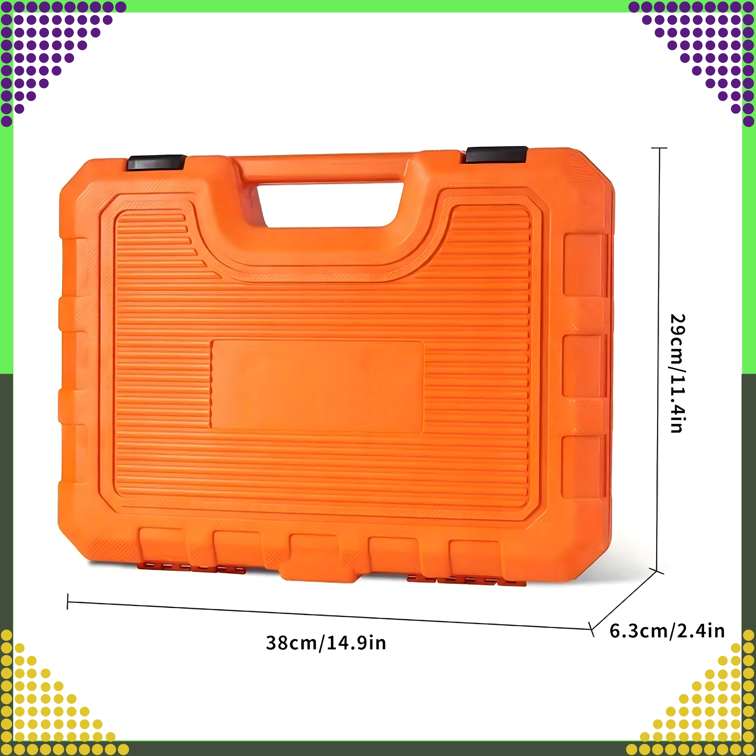 Douilles métriques et SAE, cliquet, rallonges et adaptateurs disposés de manière claire dans une mallette orange résistante pour un transport aisé.