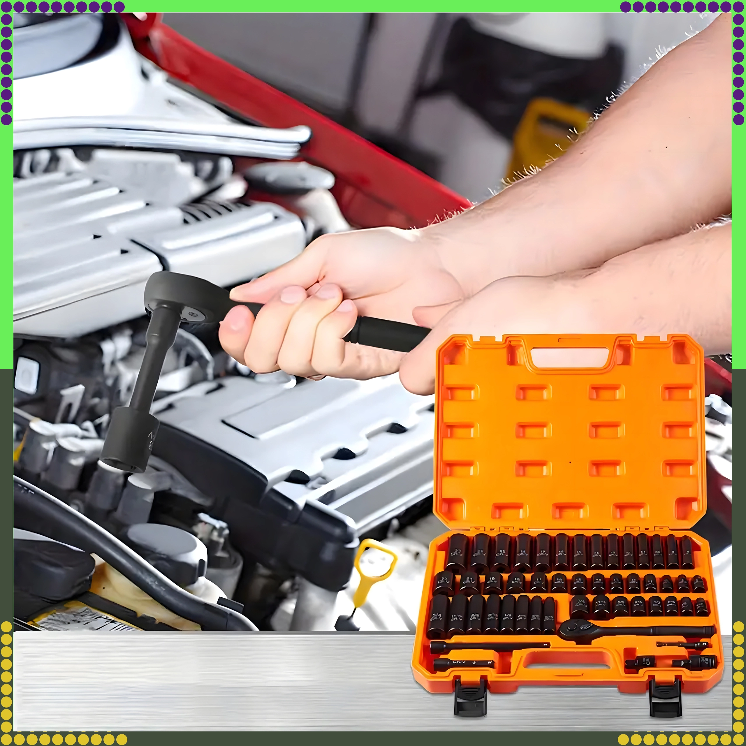 - Équipement complet 50 pièces : douilles métriques et SAE, cliquet 3/8'', rallonges, joint universel.