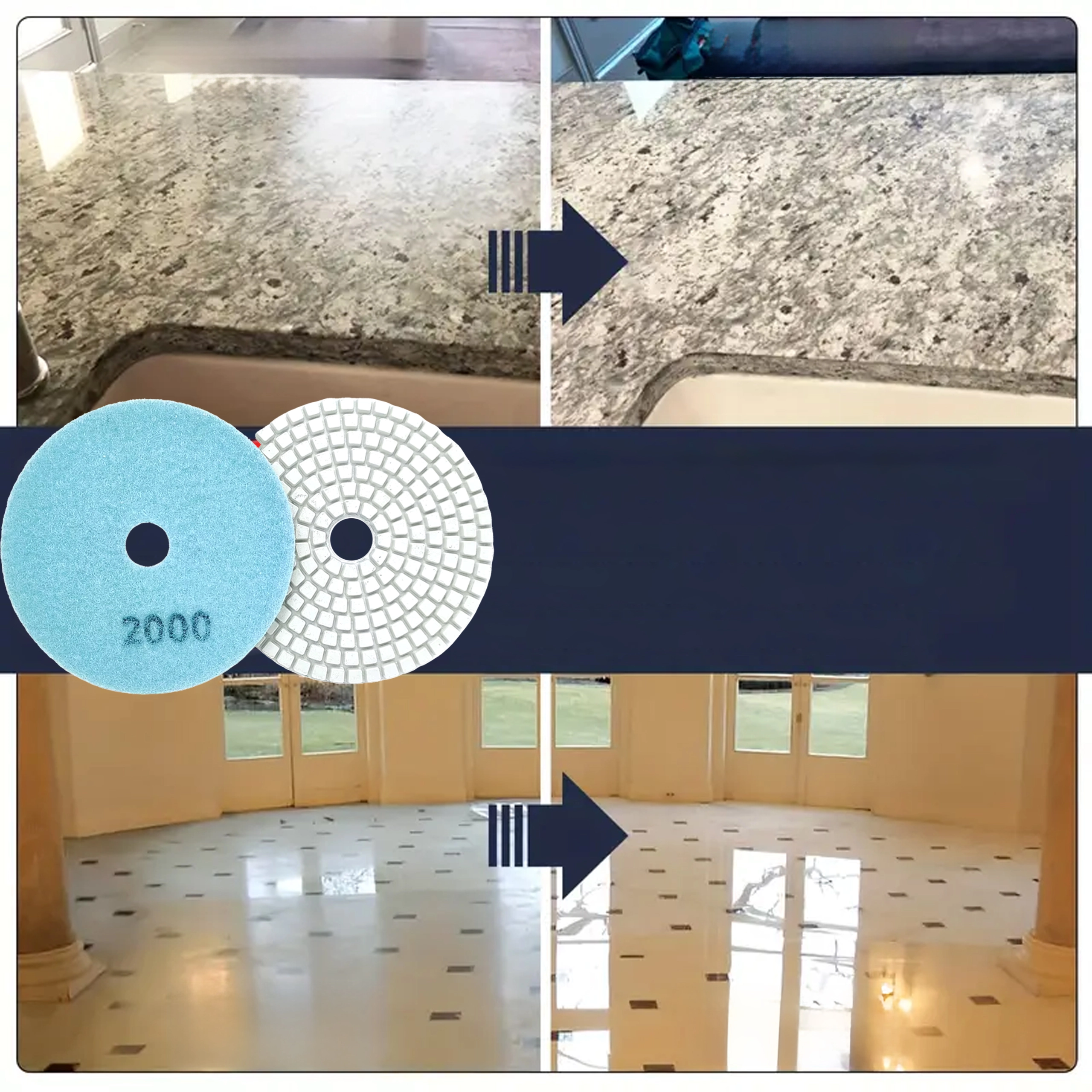 Polissage final des carreaux, de la pierre et du béton avec une brillance uniforme sans rayures. Idéal pour la dernière étape du ponçage.