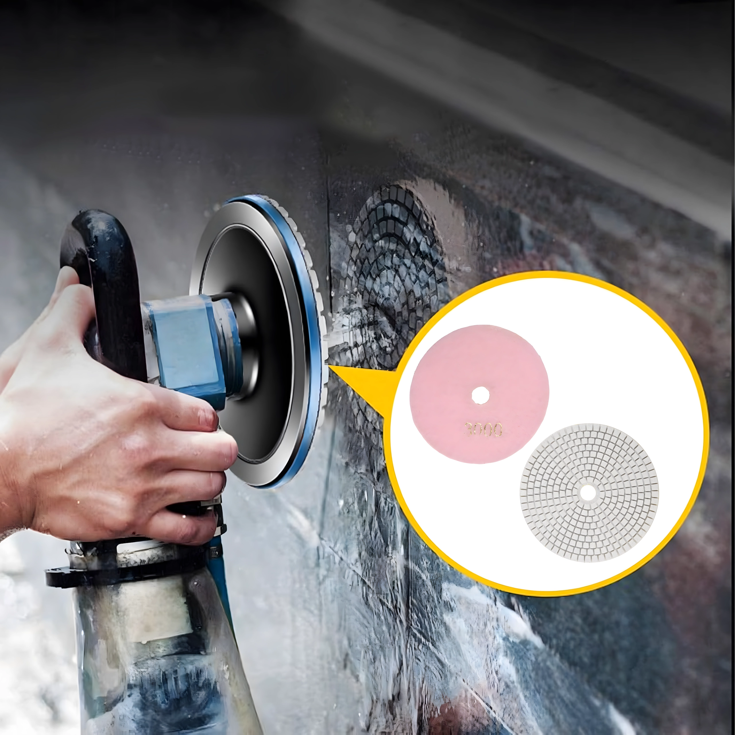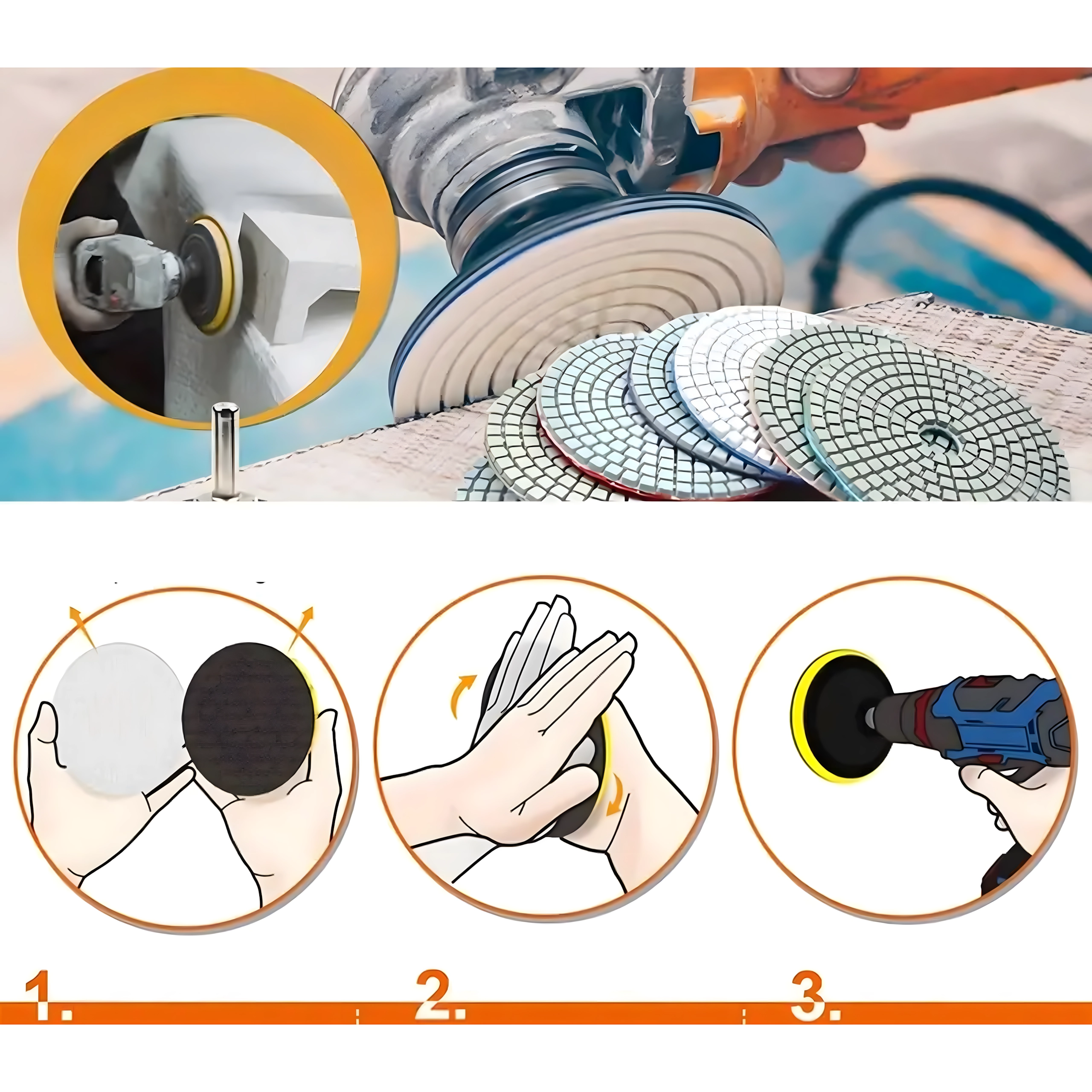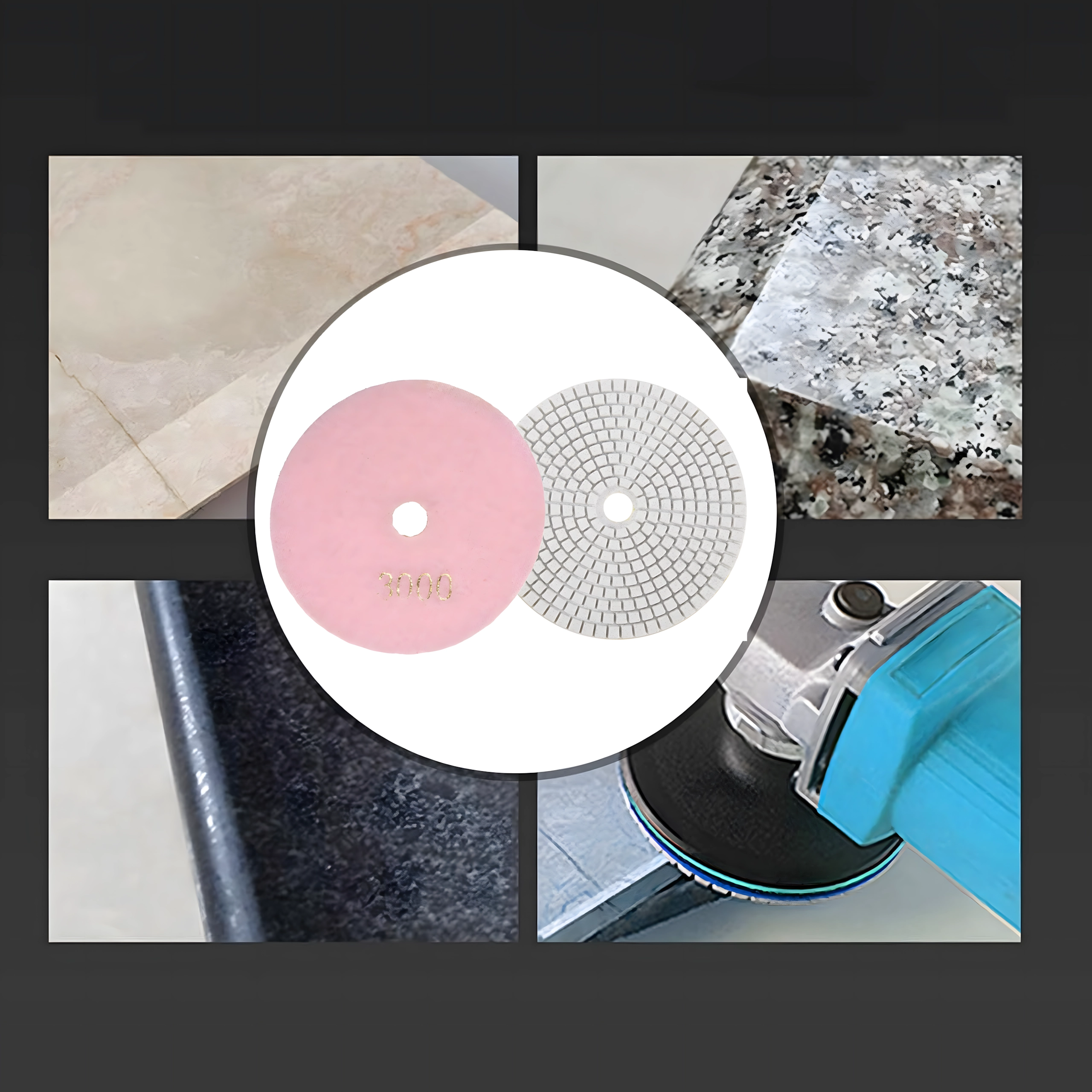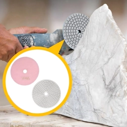 Matériaux compatibles : grès cérame, céramique, pierre naturelle, granit, marbre et autres surfaces dures. Le Velcro assure une mise en place et un remplacement rapides des disques sur le plateau support et les meuleuses/polisseuses compatibles. Le travail à l’eau comme à sec augmente la polyvalence d’usage et la qualité du résultat.