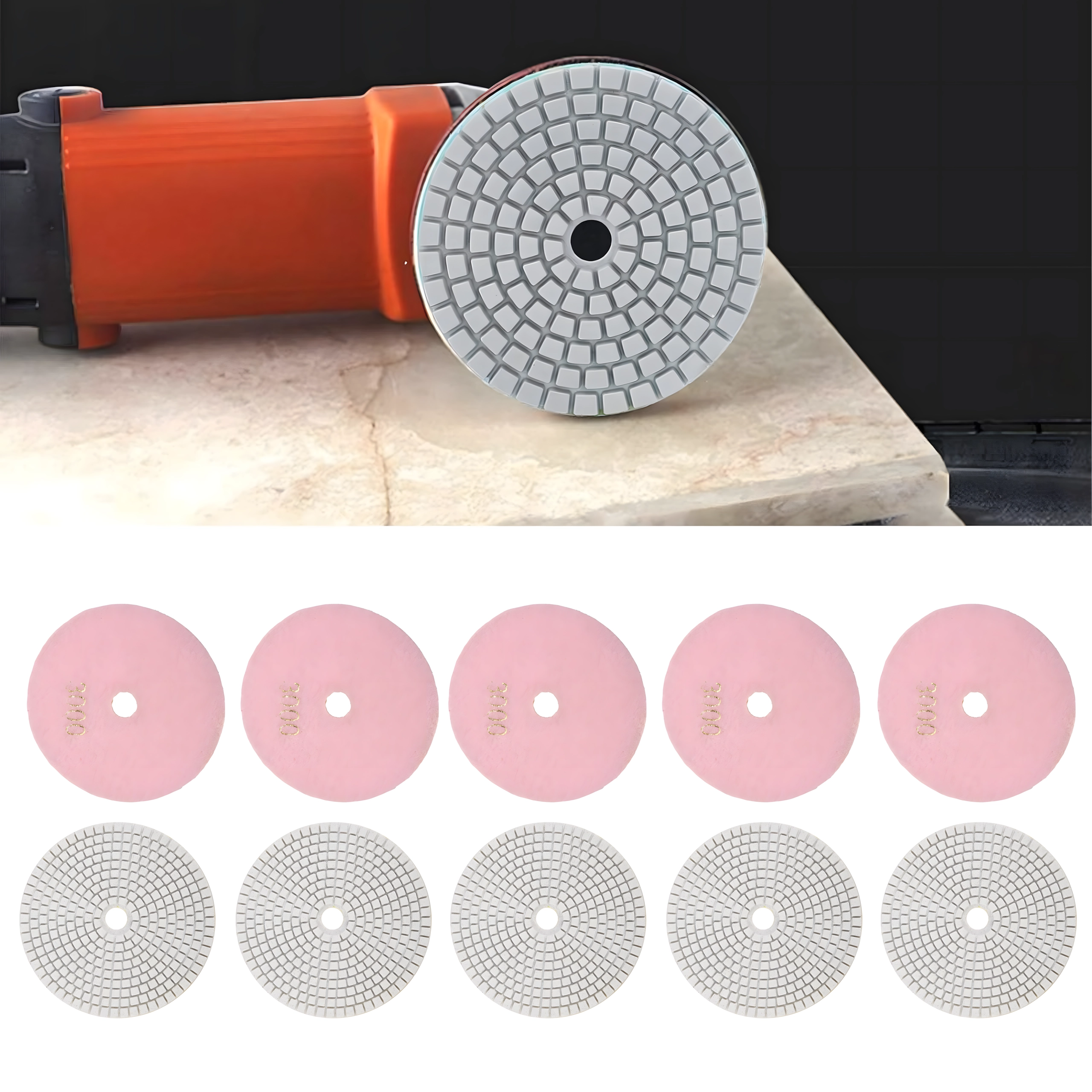 Ensemble professionnel de 10 disques de polissage diamantés de 80 mm de diamètre pour le ponçage et le polissage précis du grès cérame, des carreaux céramiques, de la pierre, du marbre et du granit. Grâce au grain 3000, vous obtenez une finition fine à haut brillant. Les disques conviennent au travail à sec et à l’eau et leur fixation Velcro permet un changement rapide et pratique.