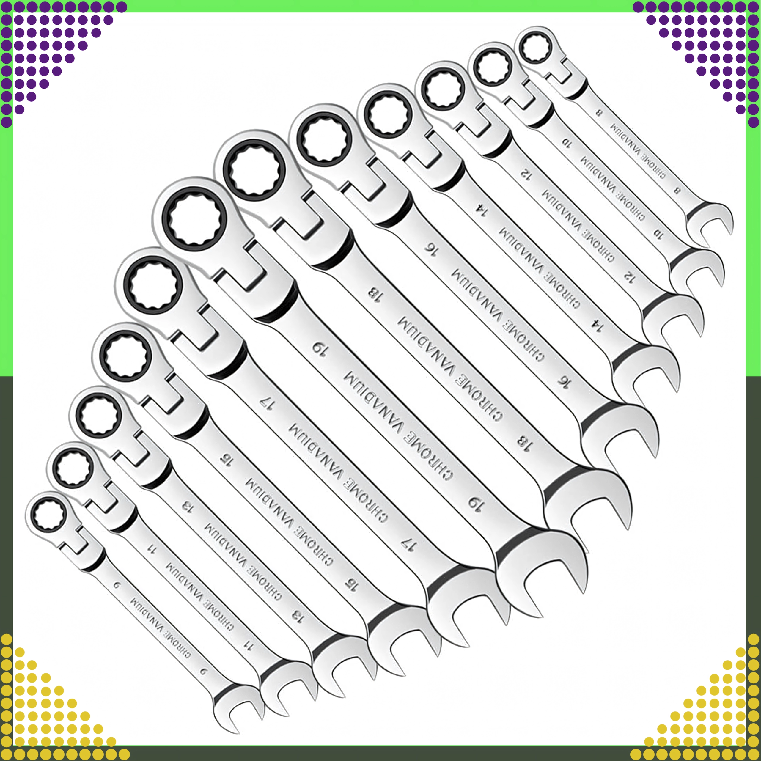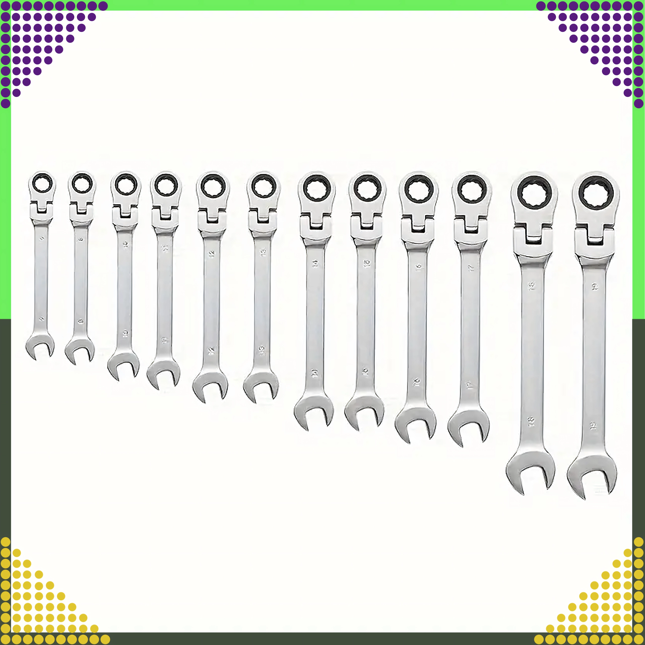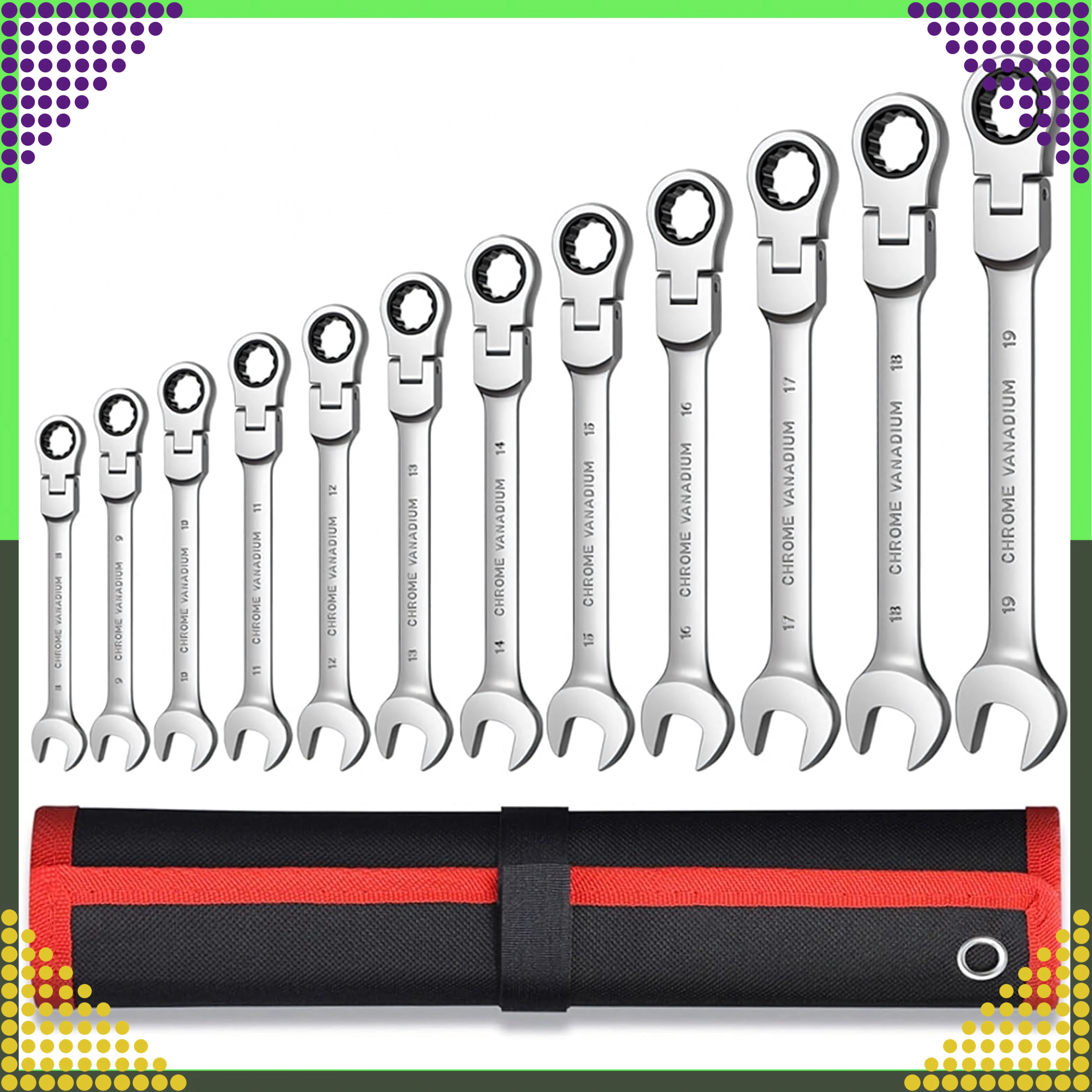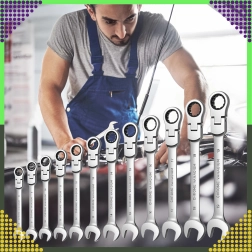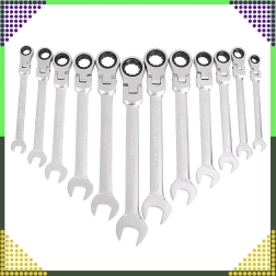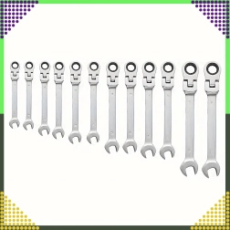Jeu universel de 12 clés mixtes à cliquet, tailles 8–19 mm, pour un serrage et desserrage rapides et précis. Fabriqué en acier chrome-vanadium robuste avec un mécanisme à cliquet pour travailler dans des espaces restreints. Livré avec un étui pratique pour un rangement clair et un transport facile.