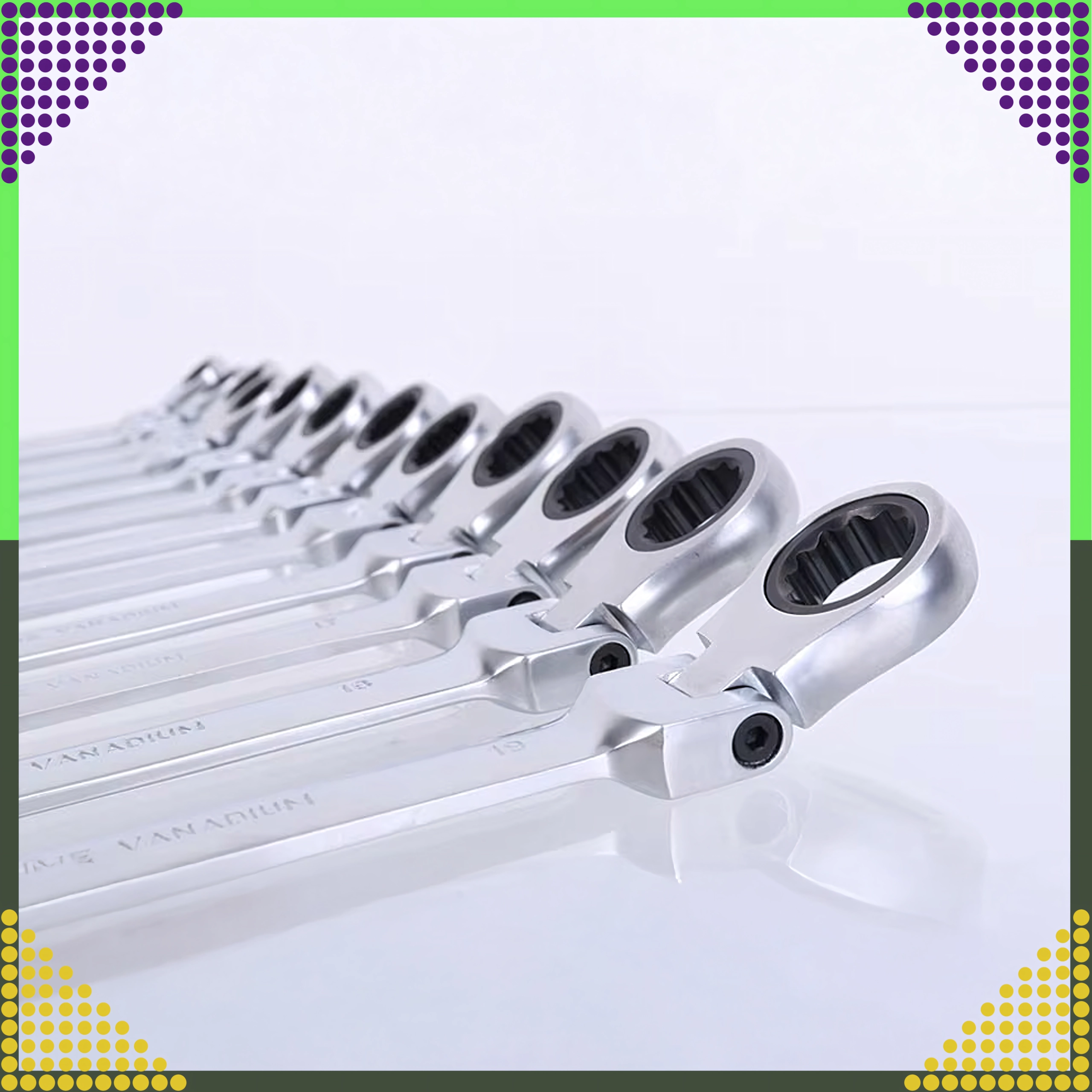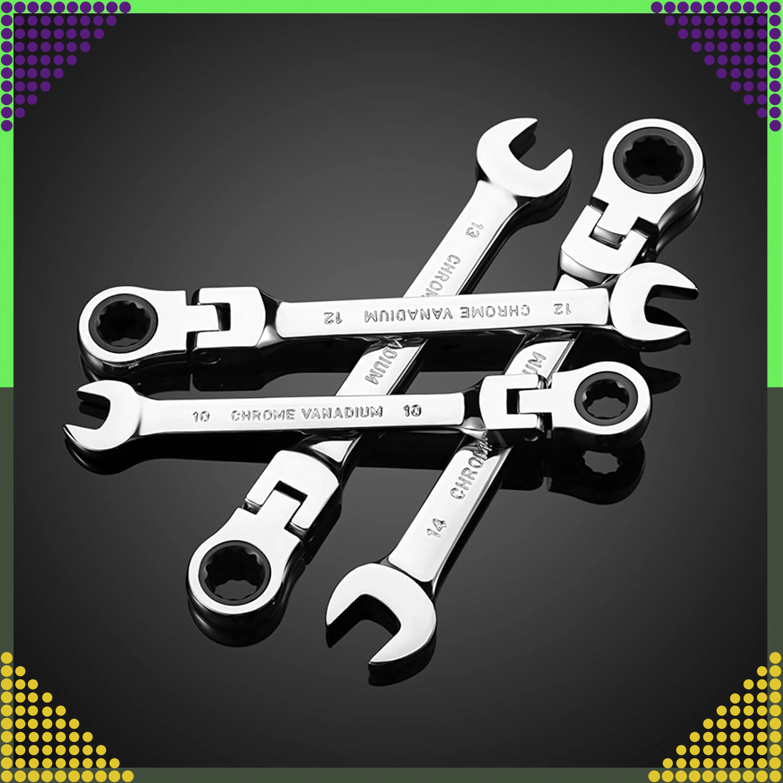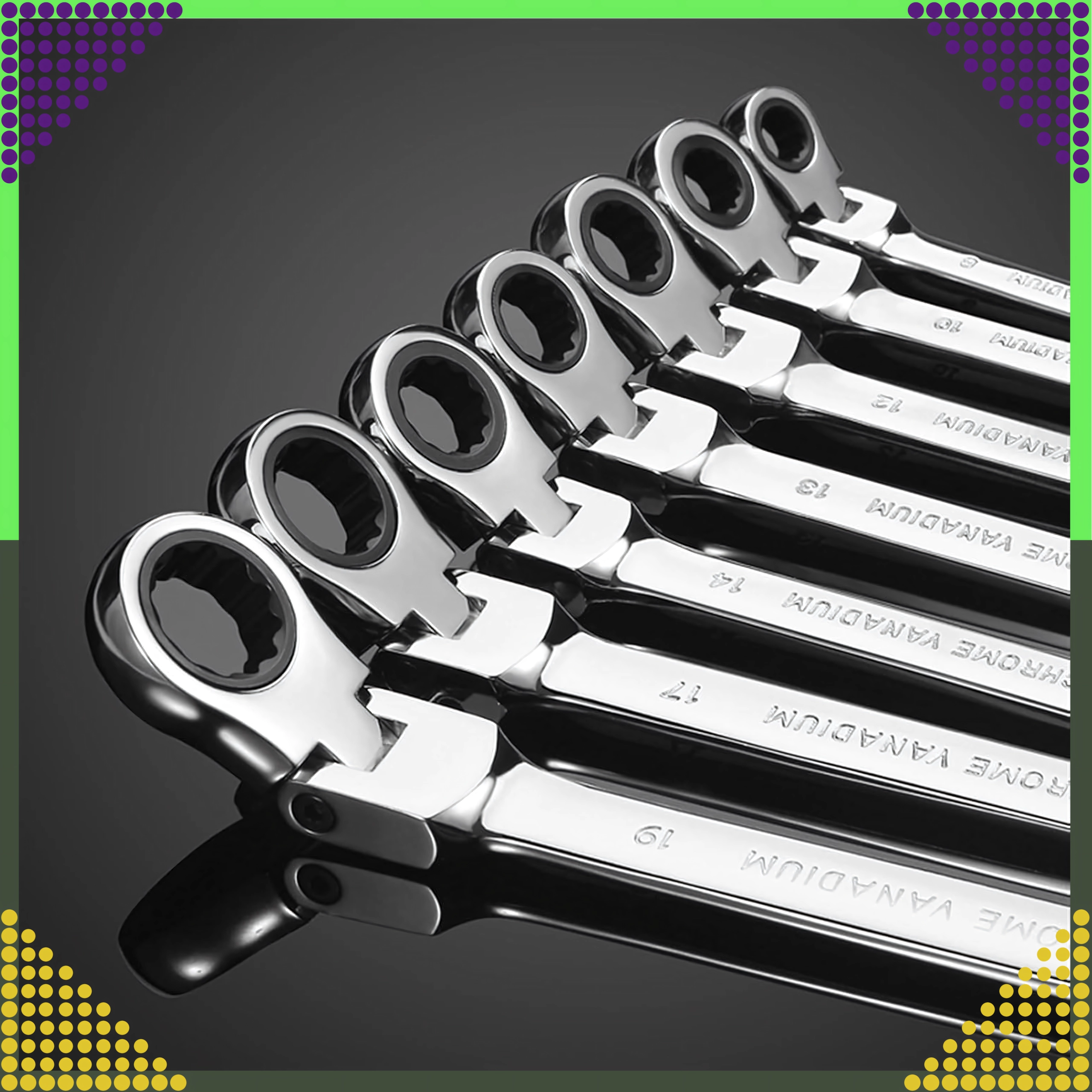 Jeu universel de 12 clés mixtes à cliquet, tailles 8–19 mm, pour un serrage et desserrage rapides et précis. Fabriqué en acier chrome-vanadium robuste avec un mécanisme à cliquet pour travailler dans des espaces restreints. Livré avec un étui pratique pour un rangement clair et un transport facile.