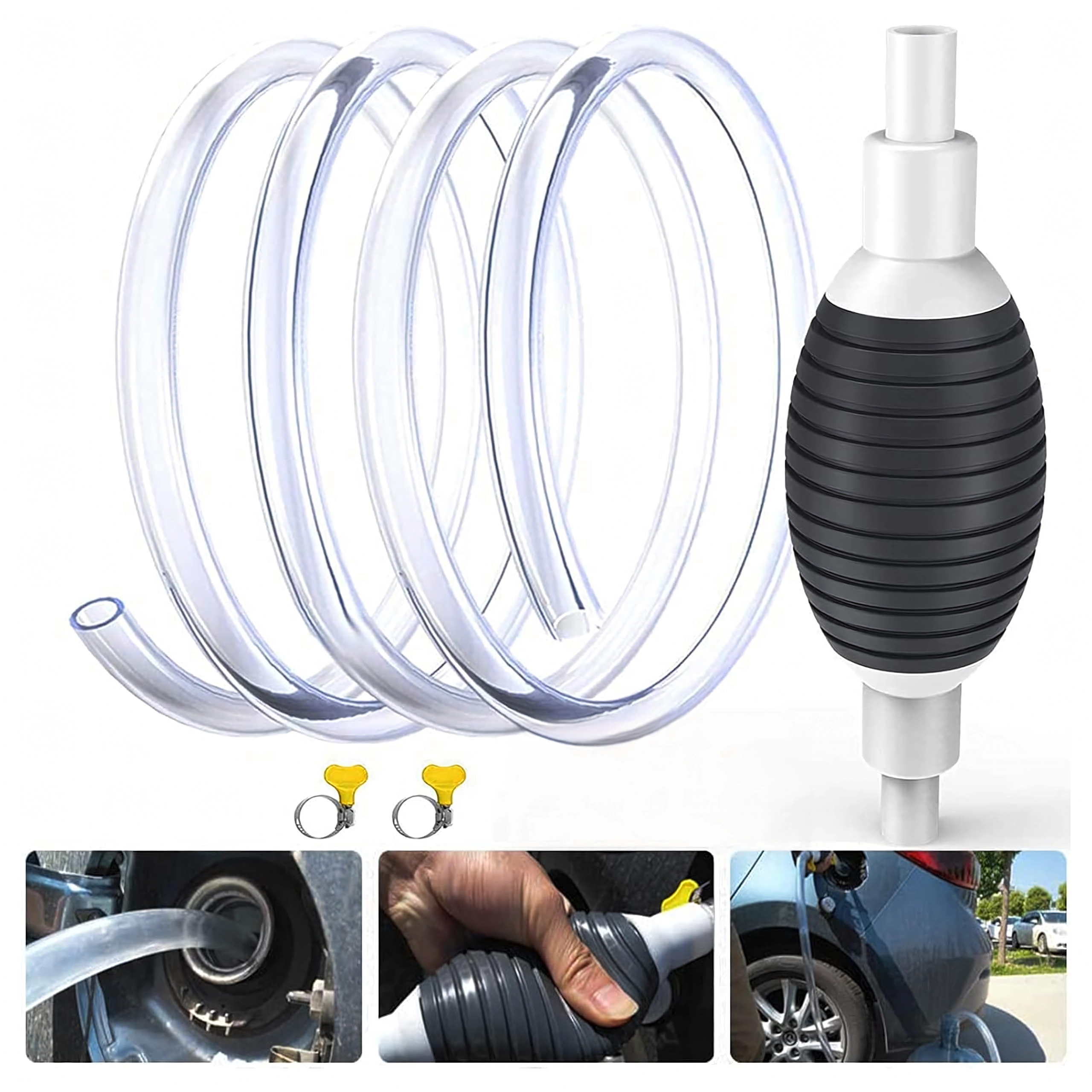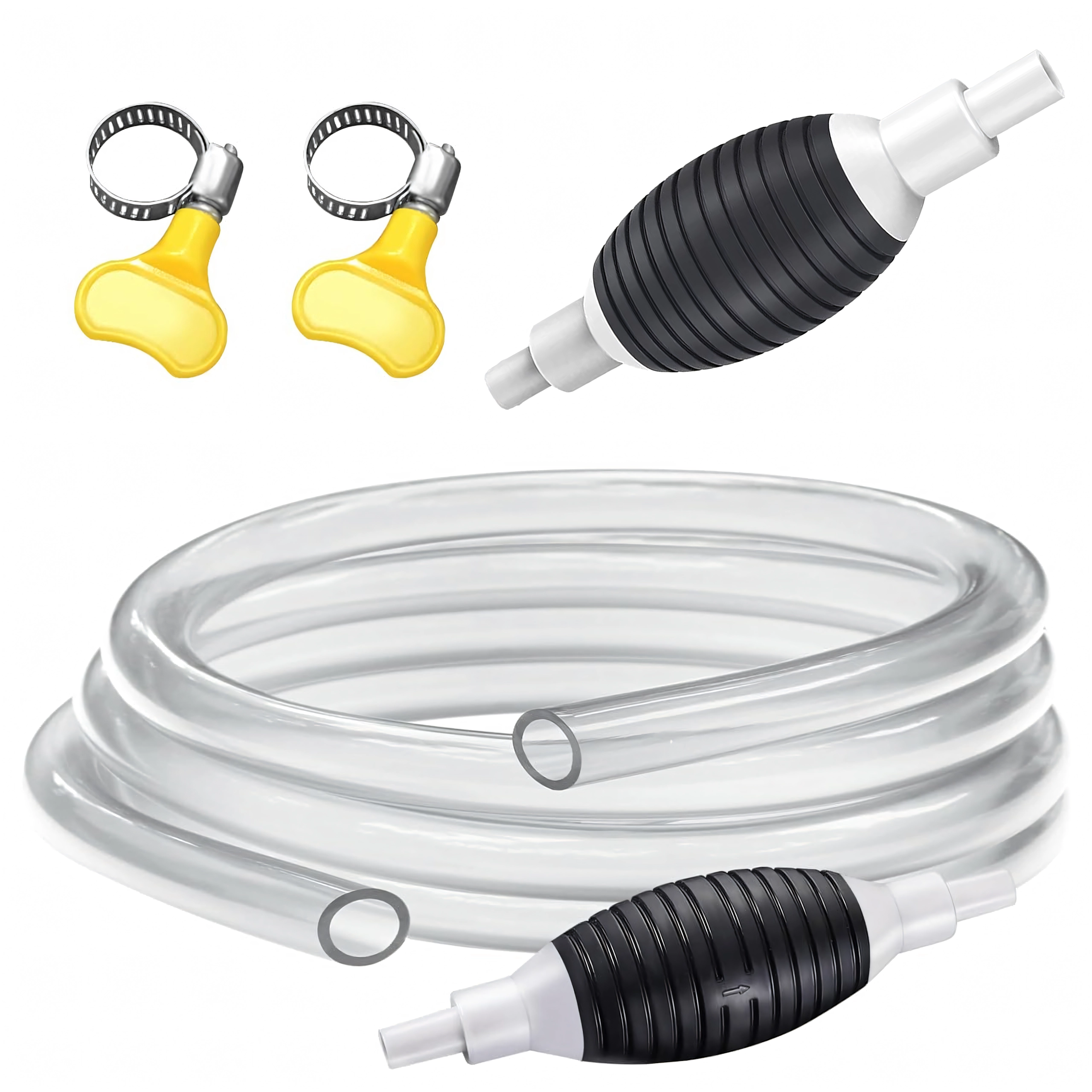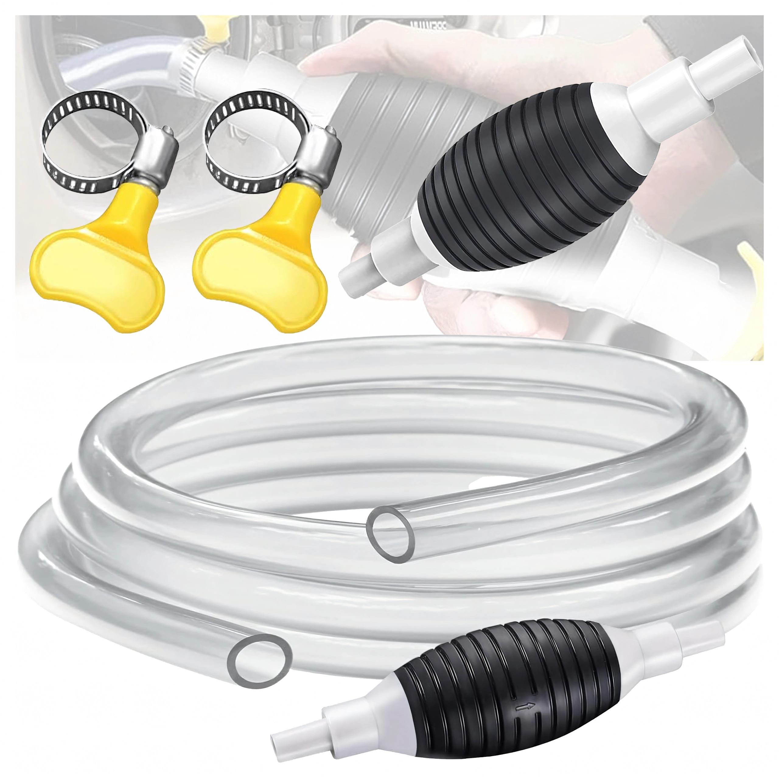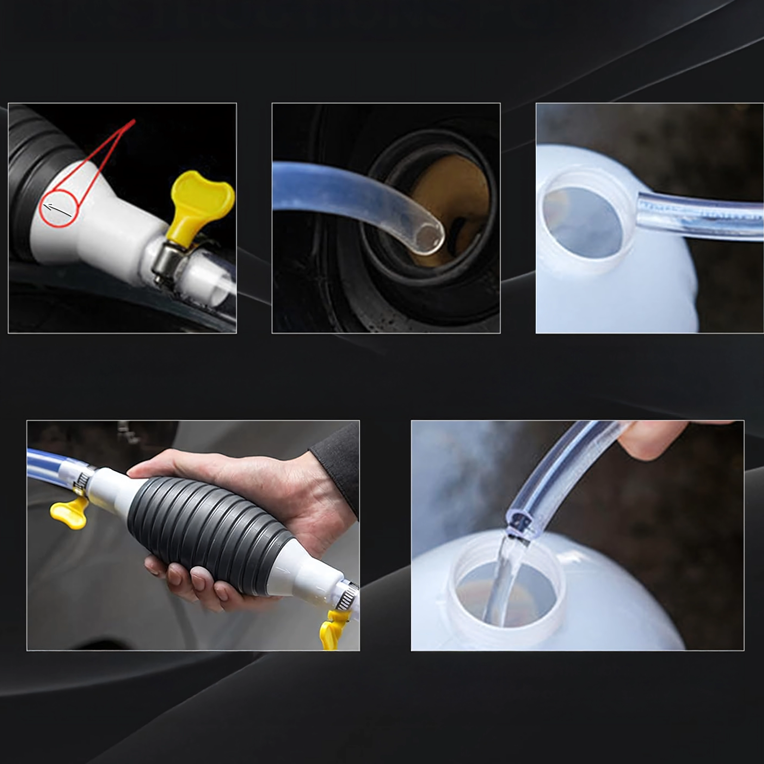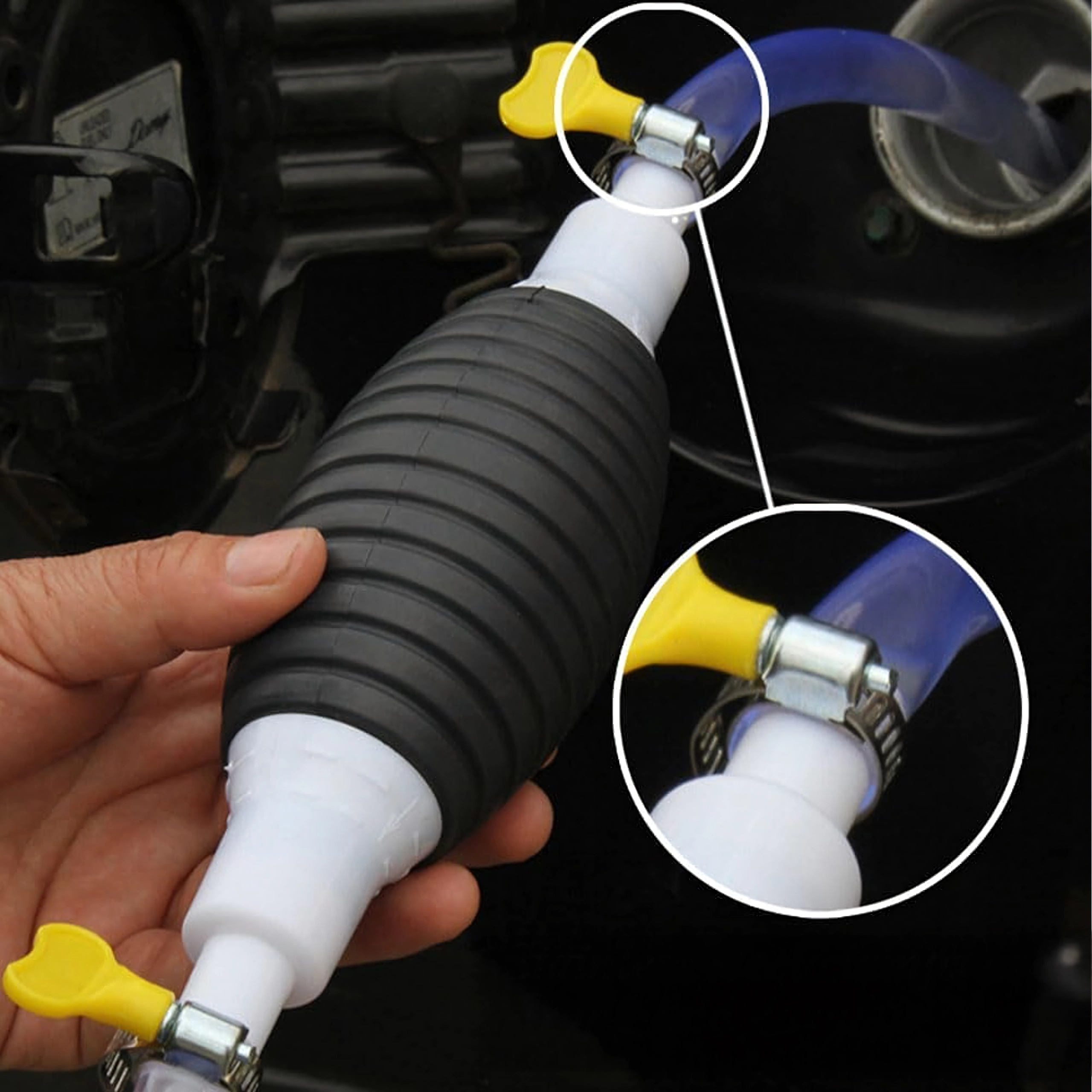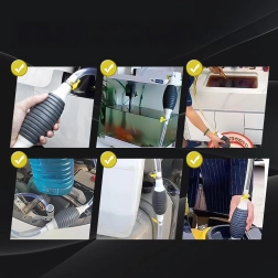 La poire d’amorçage crée immédiatement une dépression et lance l’écoulement sans éclaboussures. Le tuyau transparent permet de contrôler le flux et d’éviter le débordement.