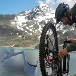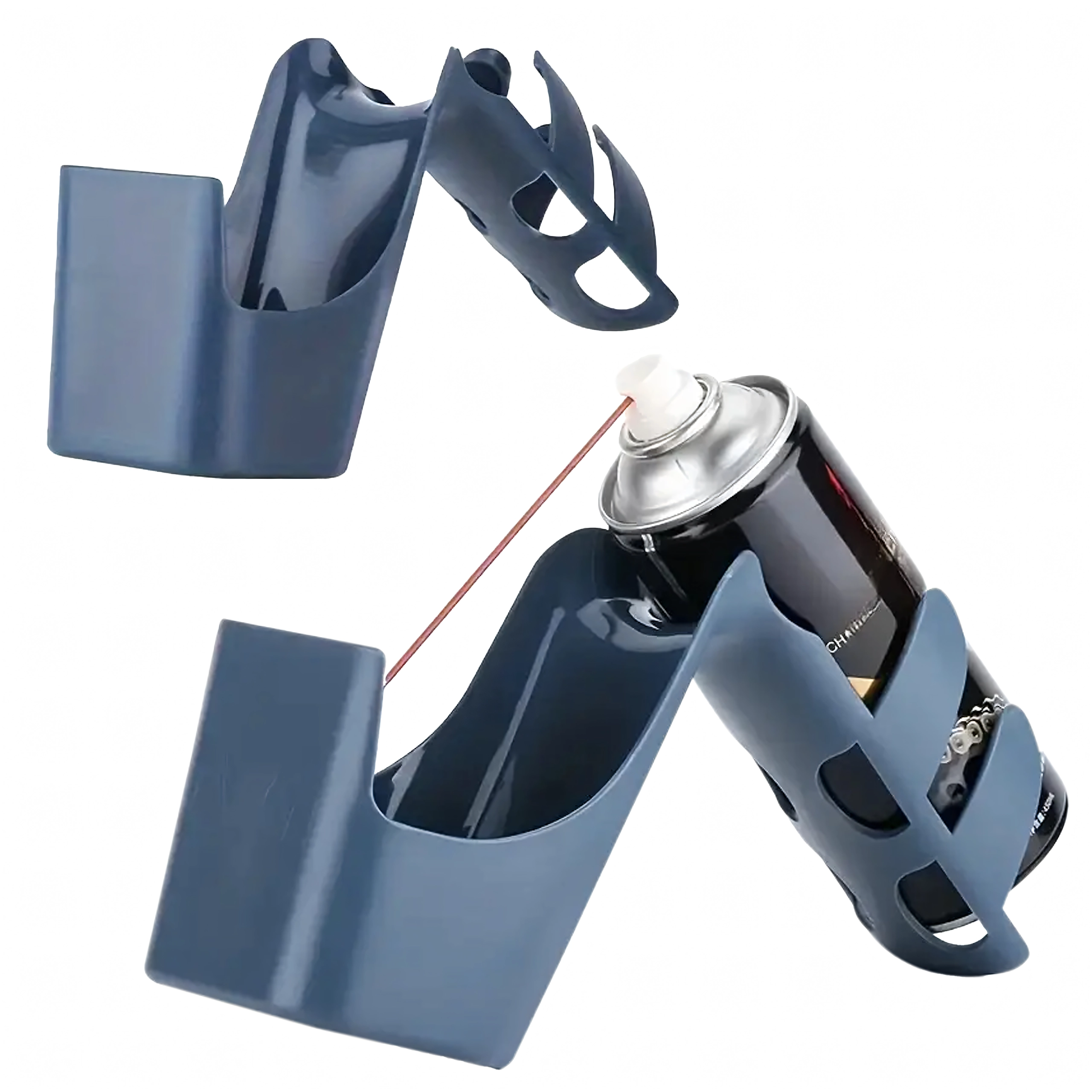 Le support maintient l’aérosol de manière stable et facilite l’application précise du lubrifiant ou du nettoyant directement sur les maillons de la chaîne.
