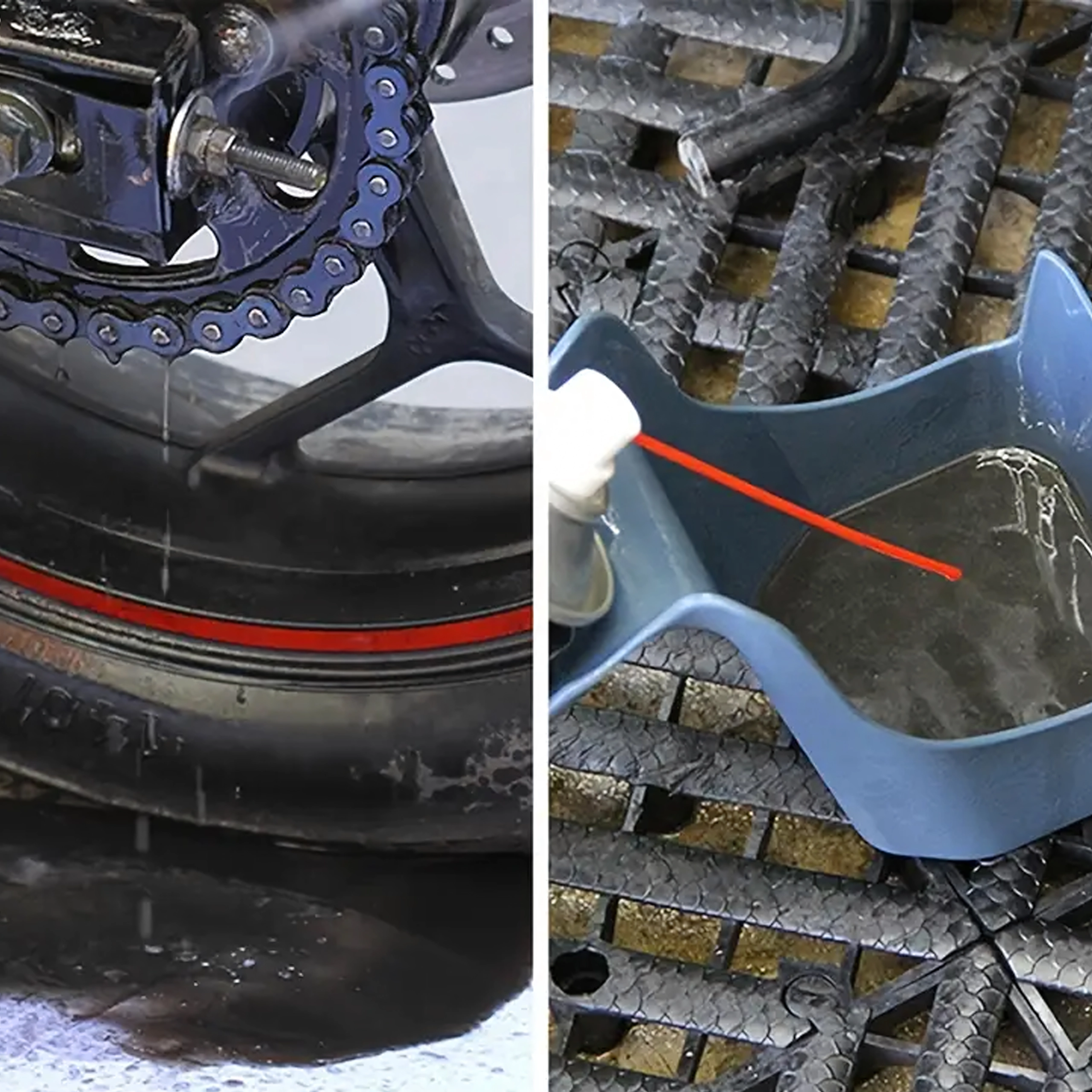 Récupérateur de gouttes et nettoyeur de chaîne pratique avec support de spray intégré pour un graissage et un nettoyage de chaîne propres et écologiques sans salissures. Corps en plastique durable résistant aux produits chimiques, compatible avec la plupart des aérosols, protégeant le vélo, la moto et l’environnement contre les projections.