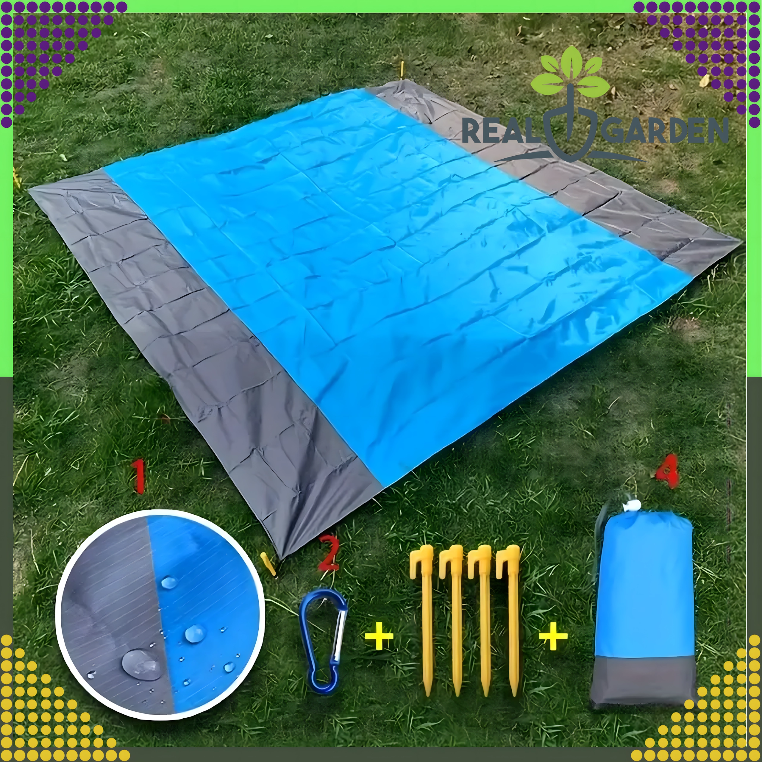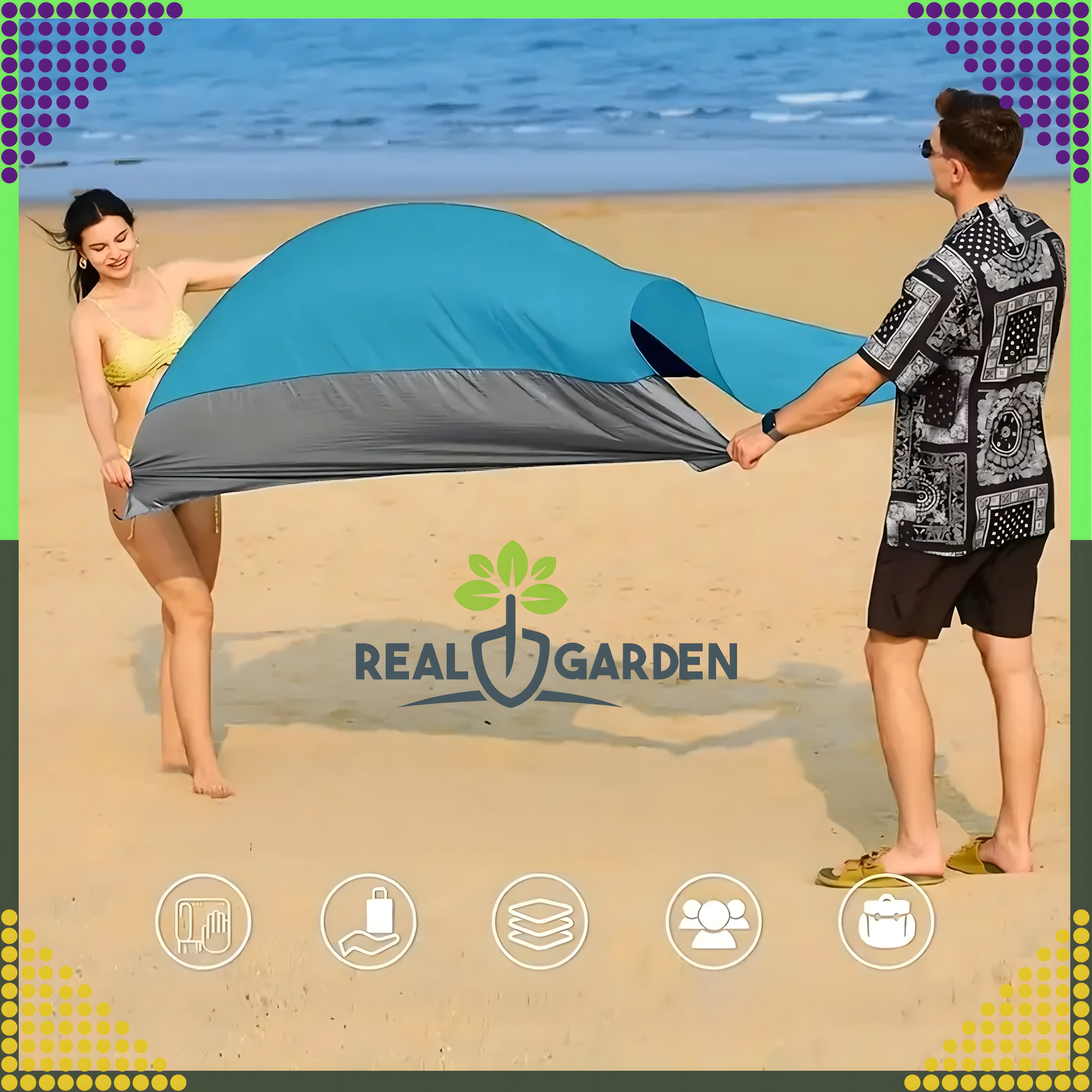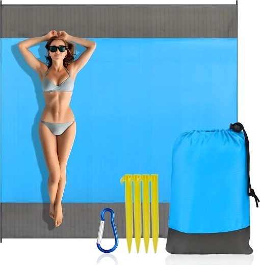 Couverture de plage/pique-nique pratique et confortable de 210 × 200 cm, idéale pour la plage, le pique-nique et le camping. Elle est imperméable, légère, facile à plier et grâce aux piquets/attaches reste bien en place. Inclut une housse pratique. La couverture protège de l’humidité, se nettoie facilement et offre assez d’espace pour toute la famille.