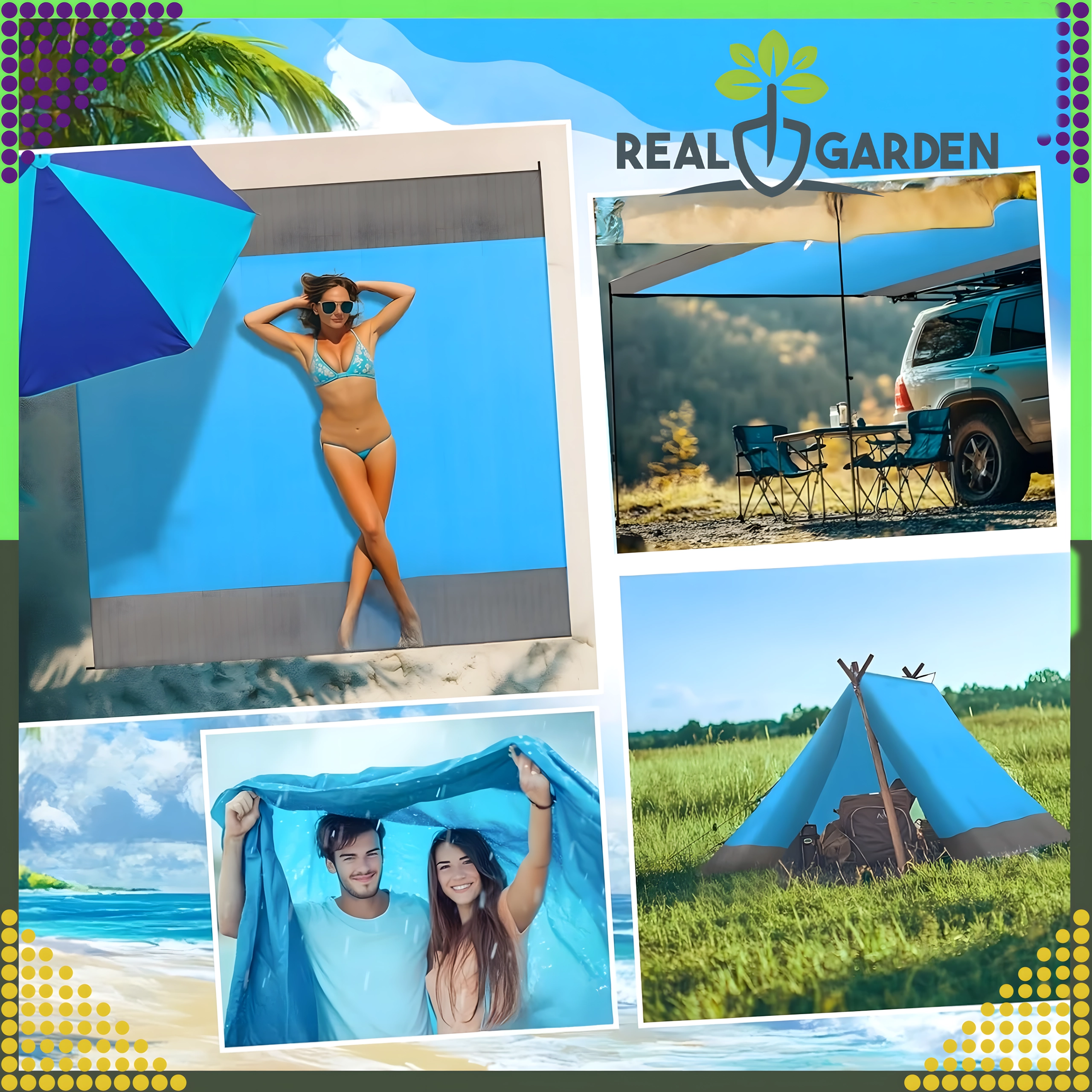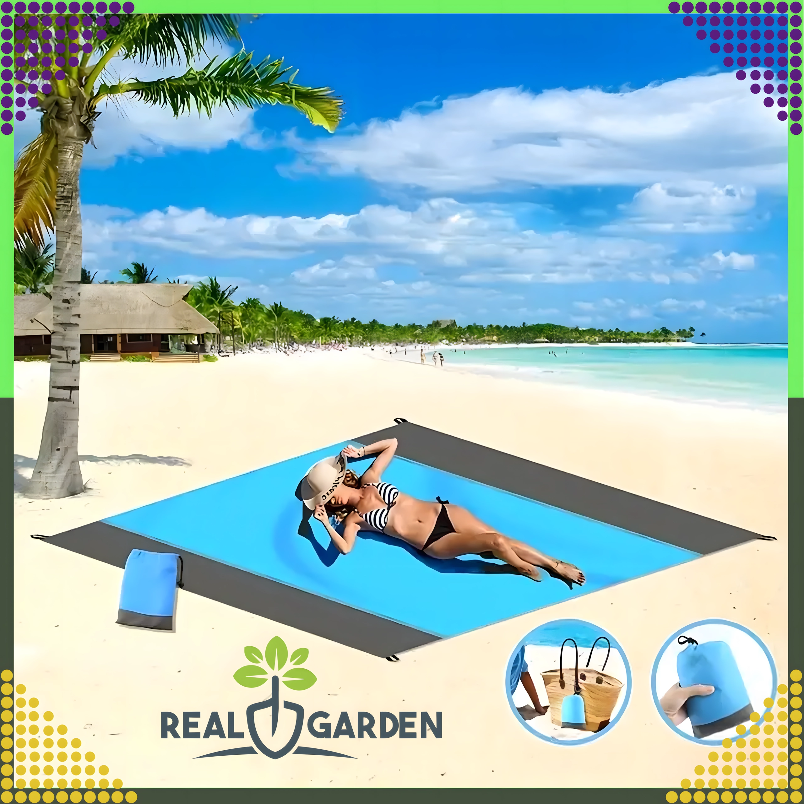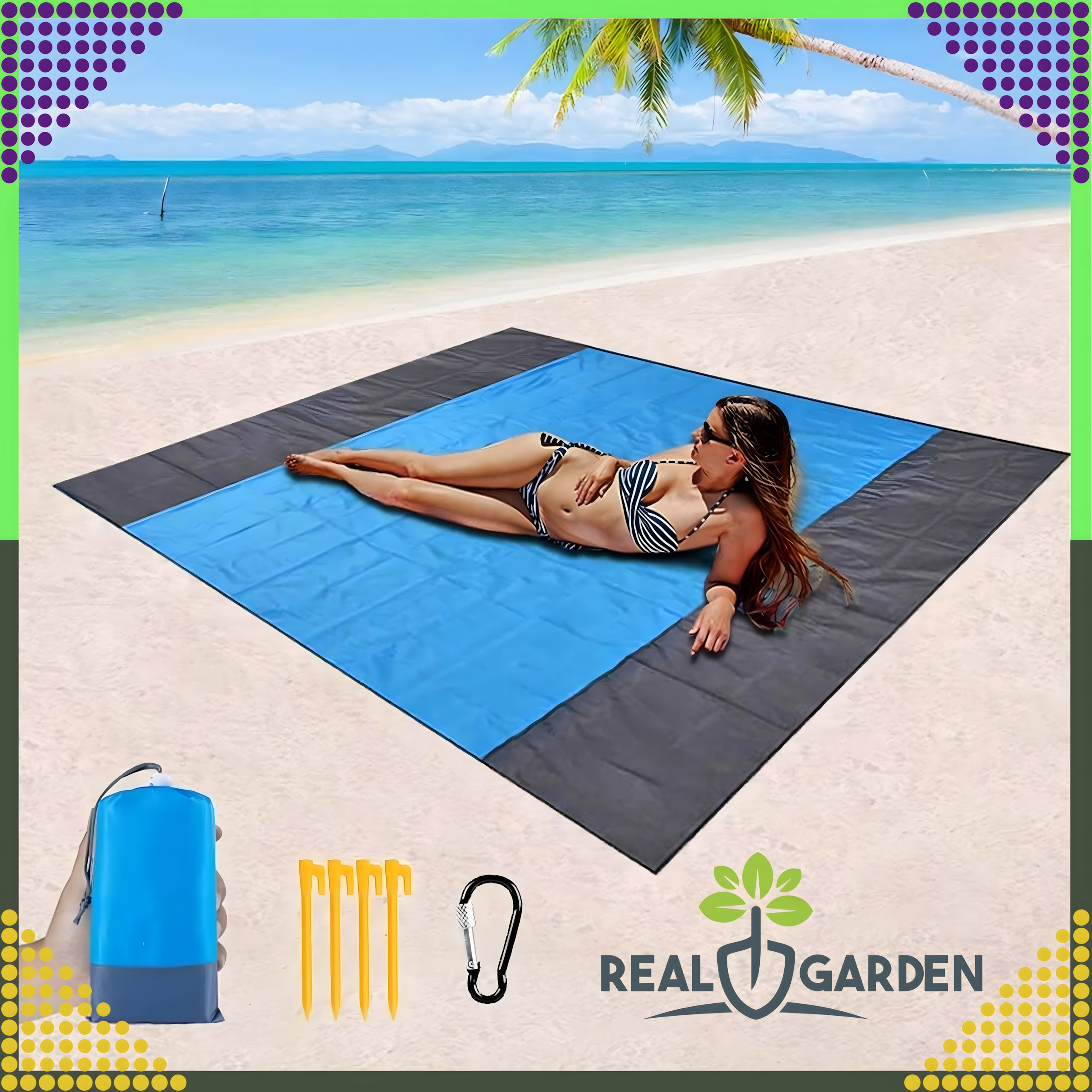 Couverture de plage/pique-nique pratique et confortable de 210 × 200 cm, idéale pour la plage, le pique-nique et le camping. Elle est imperméable, légère, facile à plier et grâce aux piquets/attaches reste bien en place. Inclut une housse pratique. La couverture protège de l’humidité, se nettoie facilement et offre assez d’espace pour toute la famille.