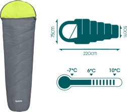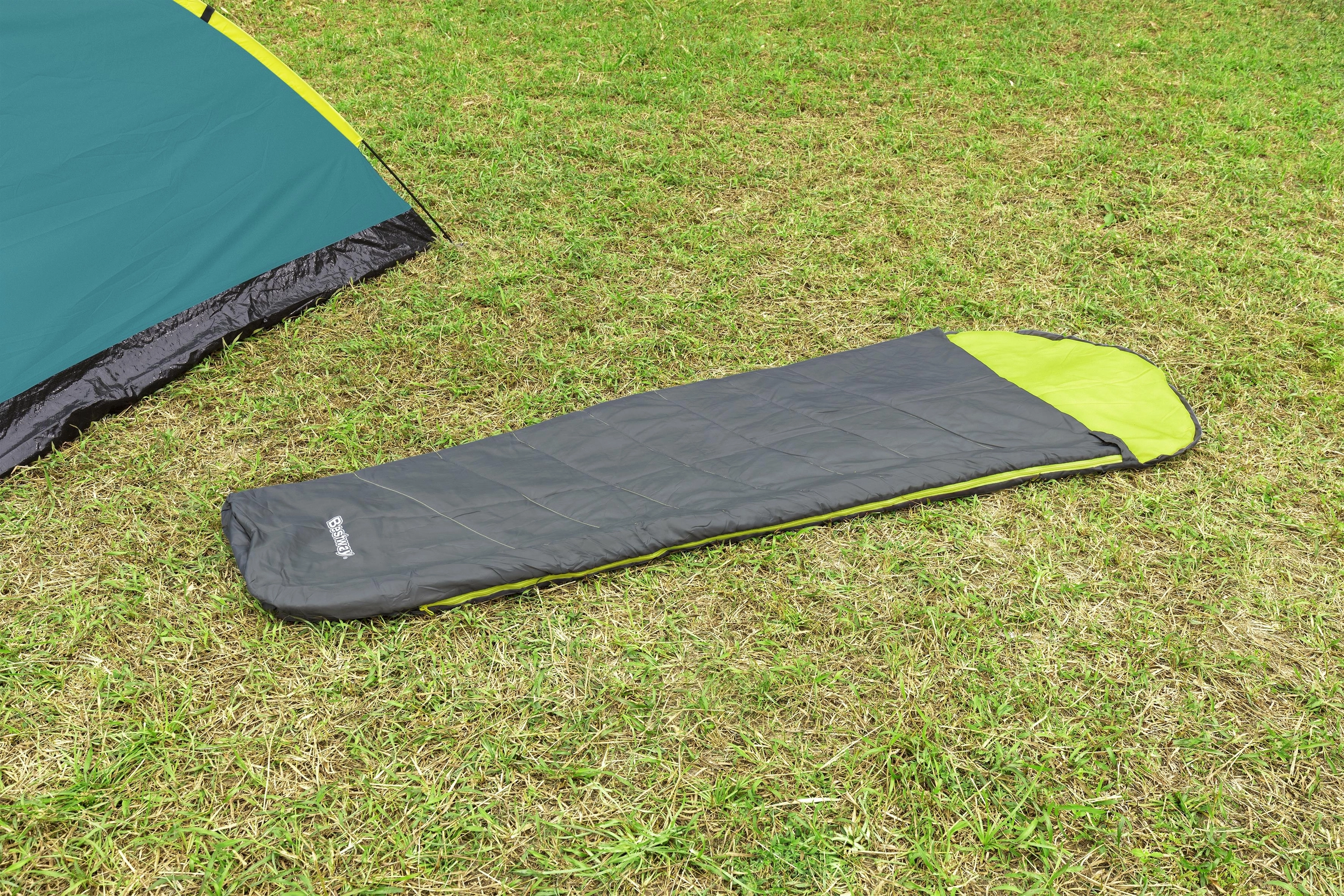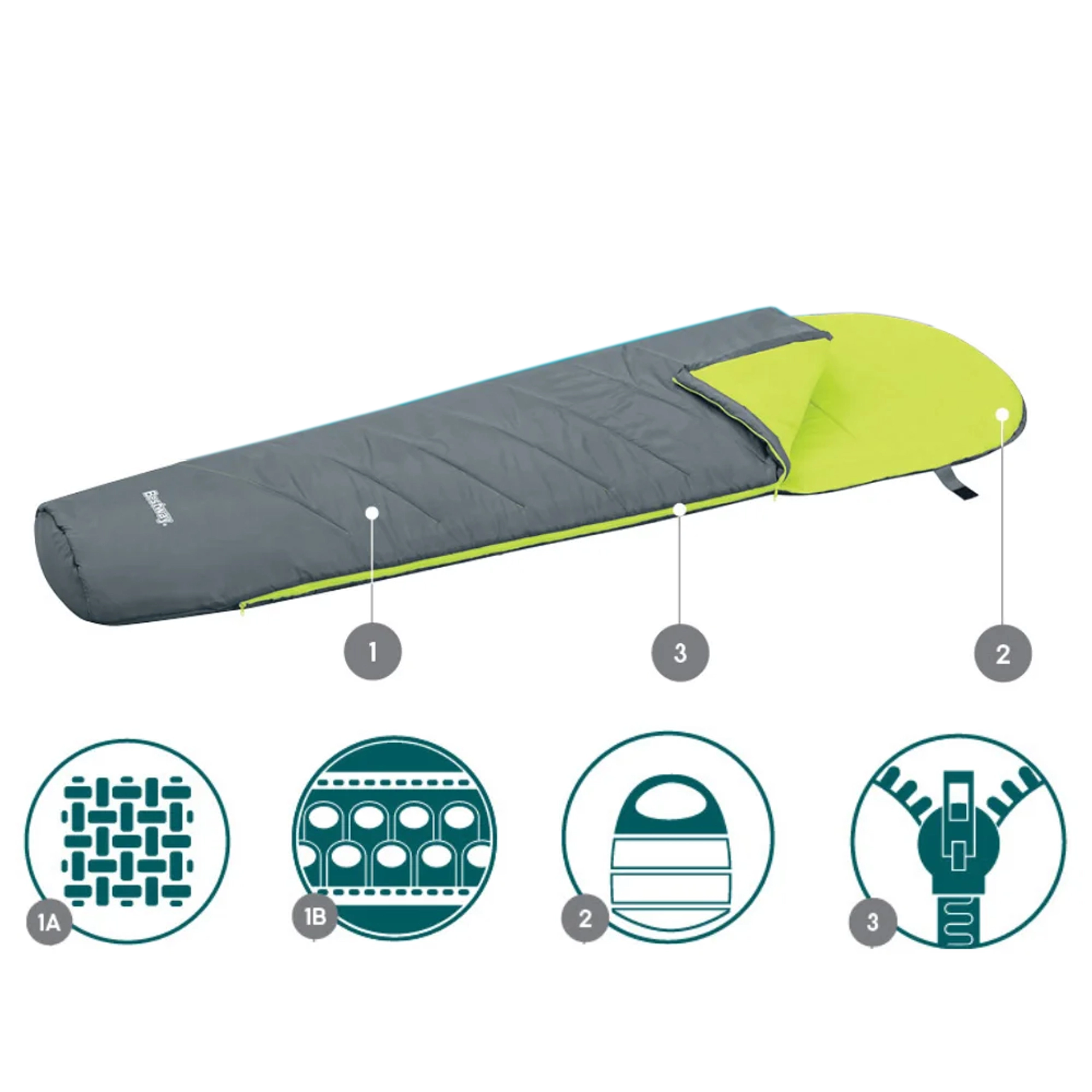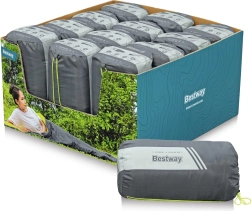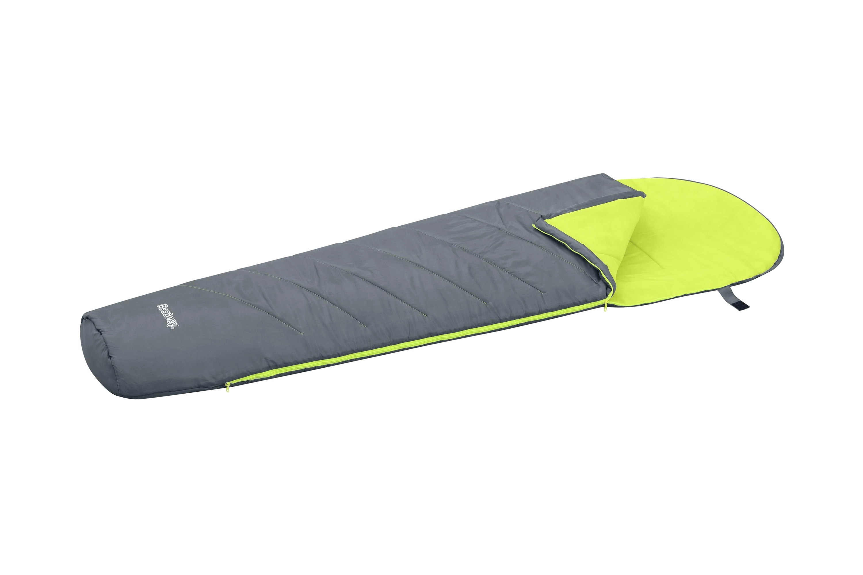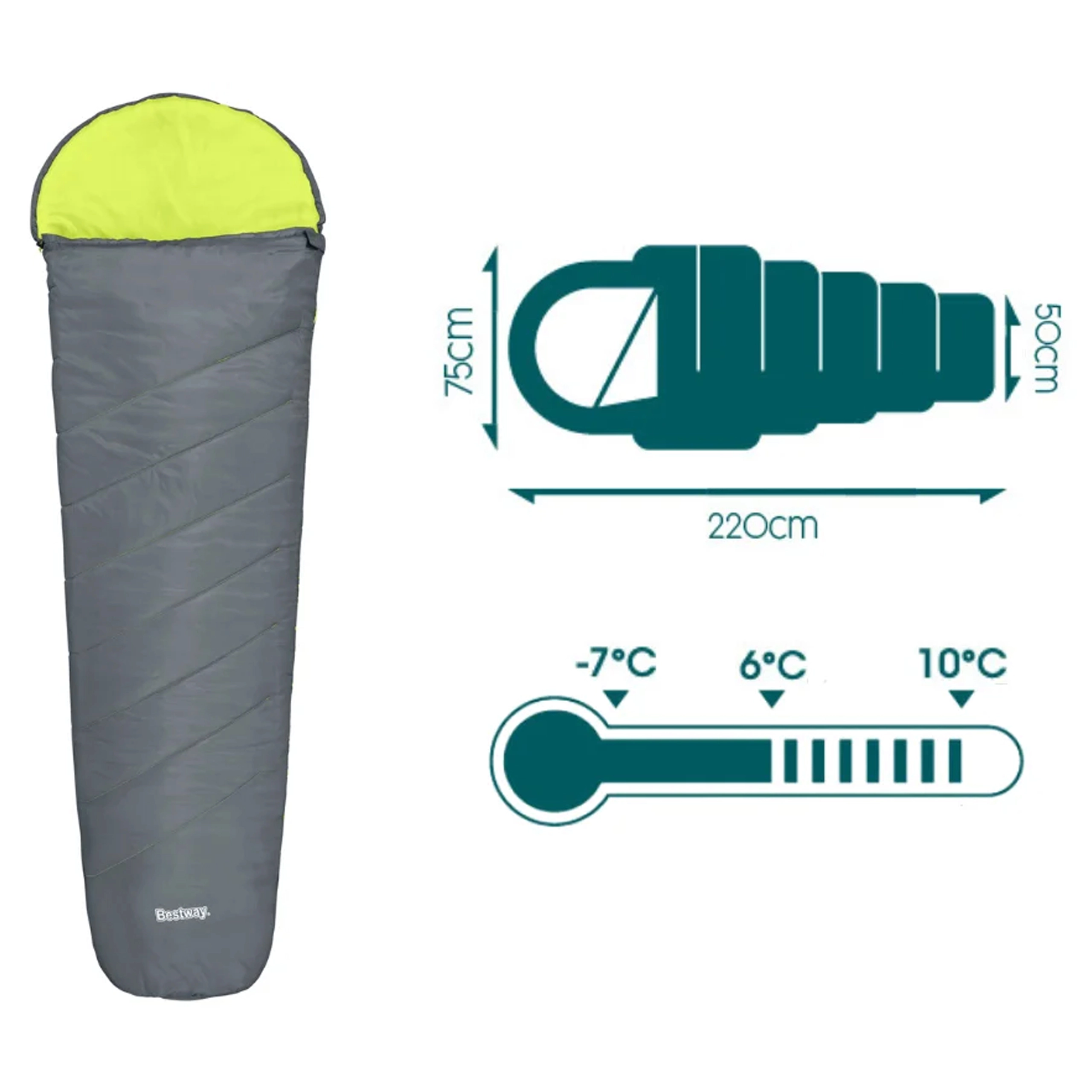 Sac de couchage type momie léger et compact de la marque Bestway pour le camping et l’outdoor. Il offre une excellente isolation, une capuche semi-circulaire pour protéger la tête et le cou, un polyester 170T résistant et un garnissage Hollow Fiber 170 g/m² avec un confort de +6 à +10 °C et une limite extrême de -7 °C.