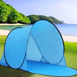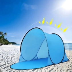 Tente de plage pop-up pratique qui s’ouvre toute seule en quelques secondes. Offre une protection contre le soleil (UV), le vent et la petite pluie. Elle est légère, compacte et idéale pour la plage, le jardin et le pique-nique. Livrée avec un sac de transport et des piquets d’ancrage.