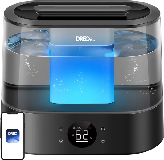 L’appareil se contrôle via l’application mobile DREO ou par la voix, permet de programmer des plages horaires, de changer les modes et de suivre l’humidité en temps réel. Le remplissage par le dessus facilite l’entretien, des protections spécifiques préviennent les dommages électroniques liés à l’humidité et la conception anti-fuite protège votre intérieur.