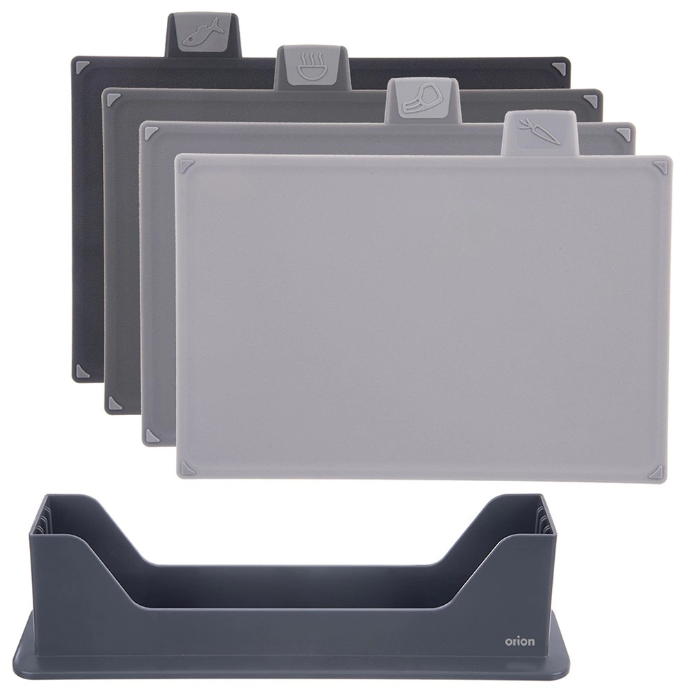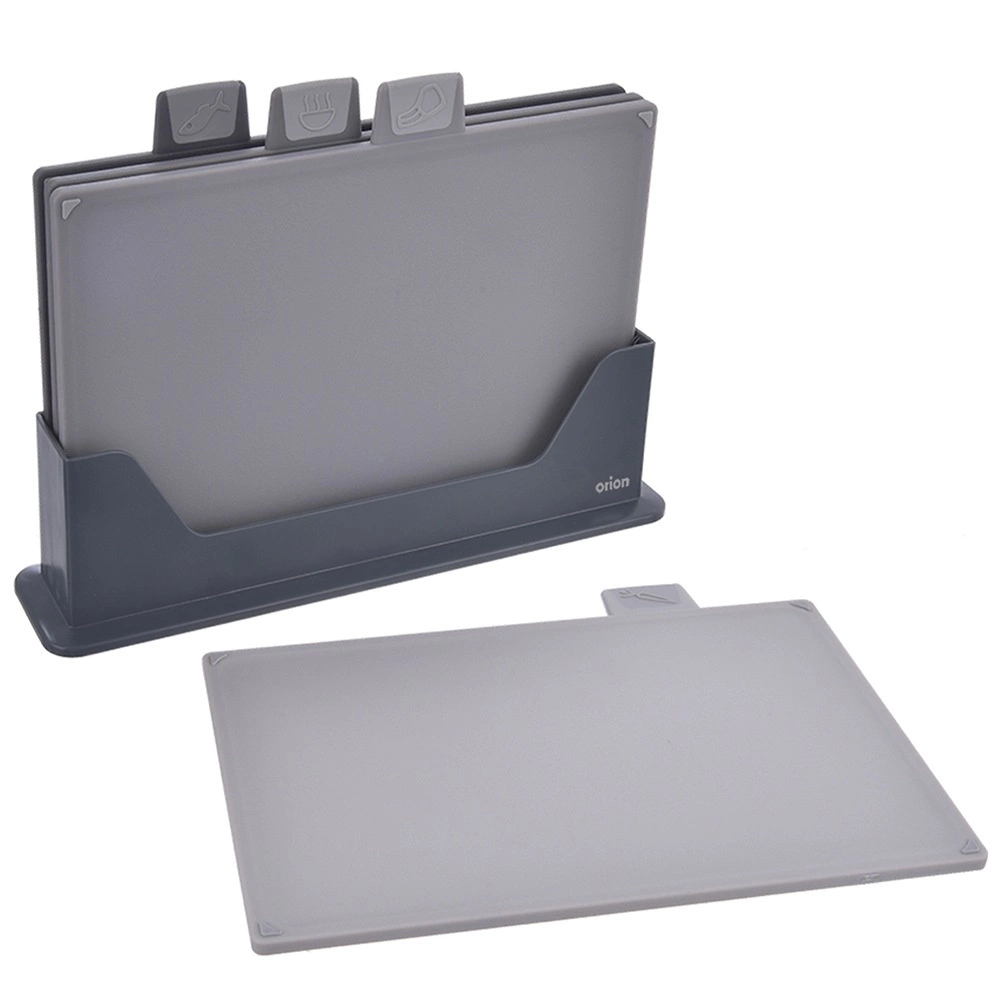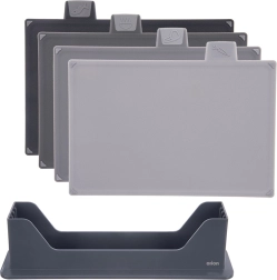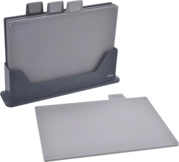 Ensemble pratique de quatre planches à découper avec support pour une cuisine hygiénique et bien organisée. Chaque planche possède sa propre icône pour un type d’aliment spécifique, ce qui aide à éviter la contamination croisée. Matériaux résistants, patins antidérapants et utilisation recto-verso garantissent une découpe sûre et confortable. Compatible lave-vaisselle et support compact avec pieds antidérapants pour tout maintenir en place.
