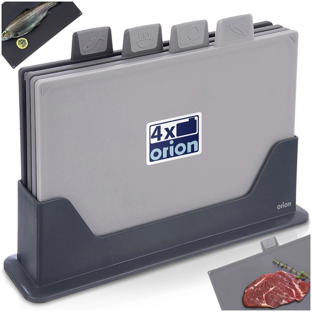 Quatre planches avec icônes pour le poisson, la viande, les légumes et les plats chauds aident à prévenir la contamination croisée et gardent la préparation des repas claire et ordonnée.