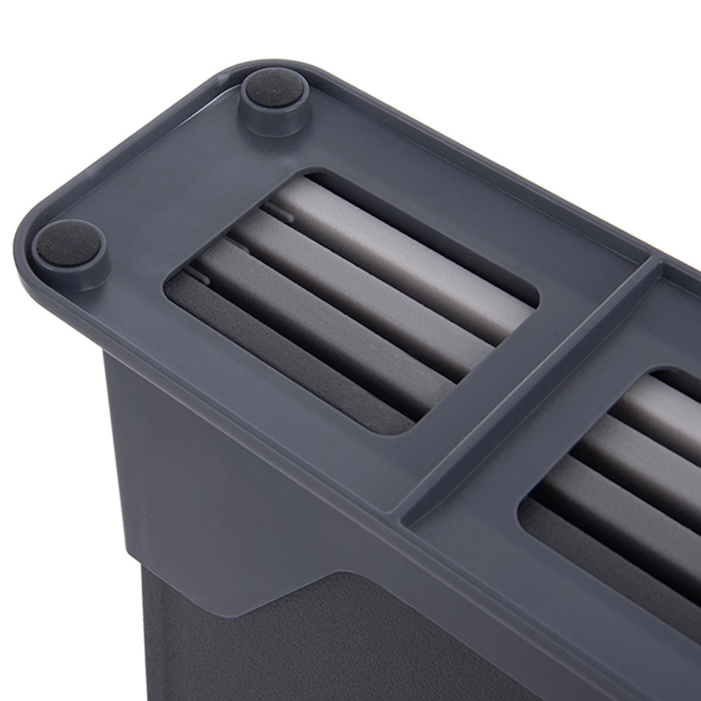 Le support compact avec des rainures profilées maintient les planches à la verticale, possède des patins en mousse antiglisse et protège le plan de travail des rayures.