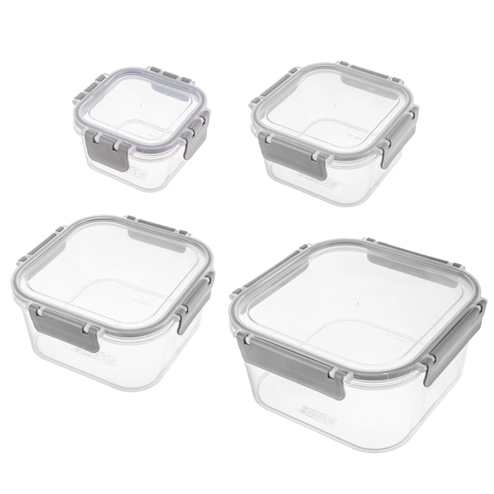 Le set comprend quatre boîtes carrées de 400 ml, 900 ml, 1,8 l et 2,9 l. Grâce au corps transparent, vous voyez rapidement le contenu, tandis que le joint en silicone et les quatre clips robustes garantissent une fermeture fiable et étanche sans fuite. Les boîtes plus petites peuvent être placées dans la plus grande, occupant ainsi un minimum d’espace dans le placard.