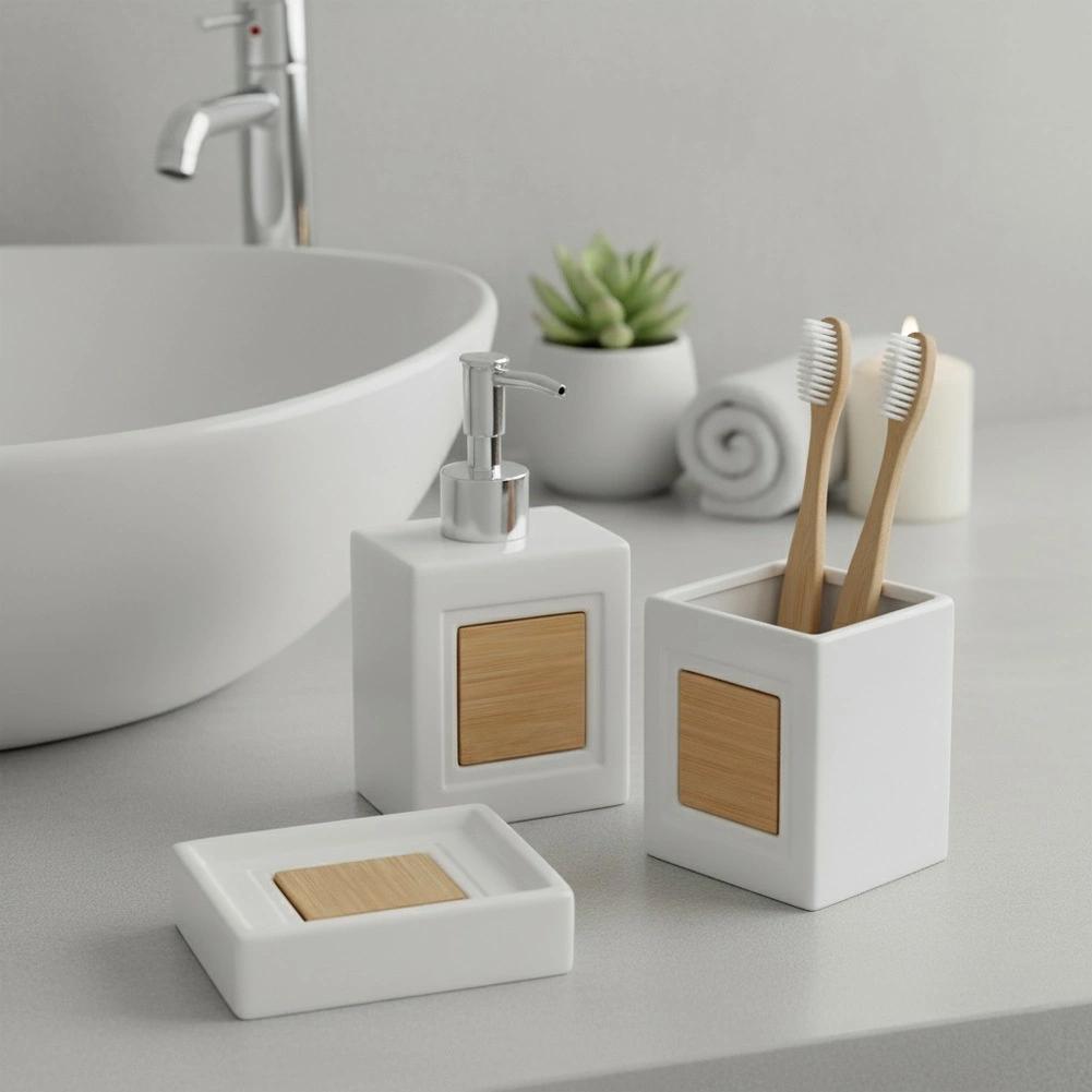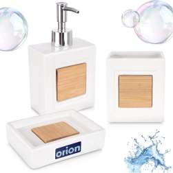 Élégant ensemble de salle de bain 3 pièces en finition blanche, combinant dolomite résistante et bambou naturel. Comprend un distributeur de savon 350 ml, un gobelet 330 ml et un porte-savon. Design minimaliste, entretien facile et style universel pour salles de bain modernes comme classiques.
