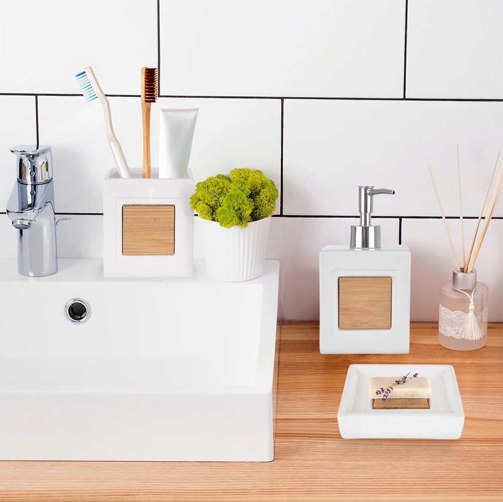 L’ensemble comprend un distributeur pour savon liquide à dosage précis, un gobelet pour brosses à dents ou accessoires cosmétiques et un porte-savon pour poser hygiéniquement un savon solide. Idéal pour la salle de bain comme pour les toilettes – aide à conserver l’ordre et une allure élégante.
