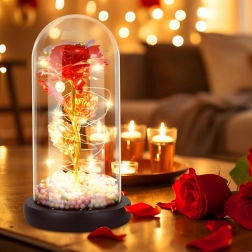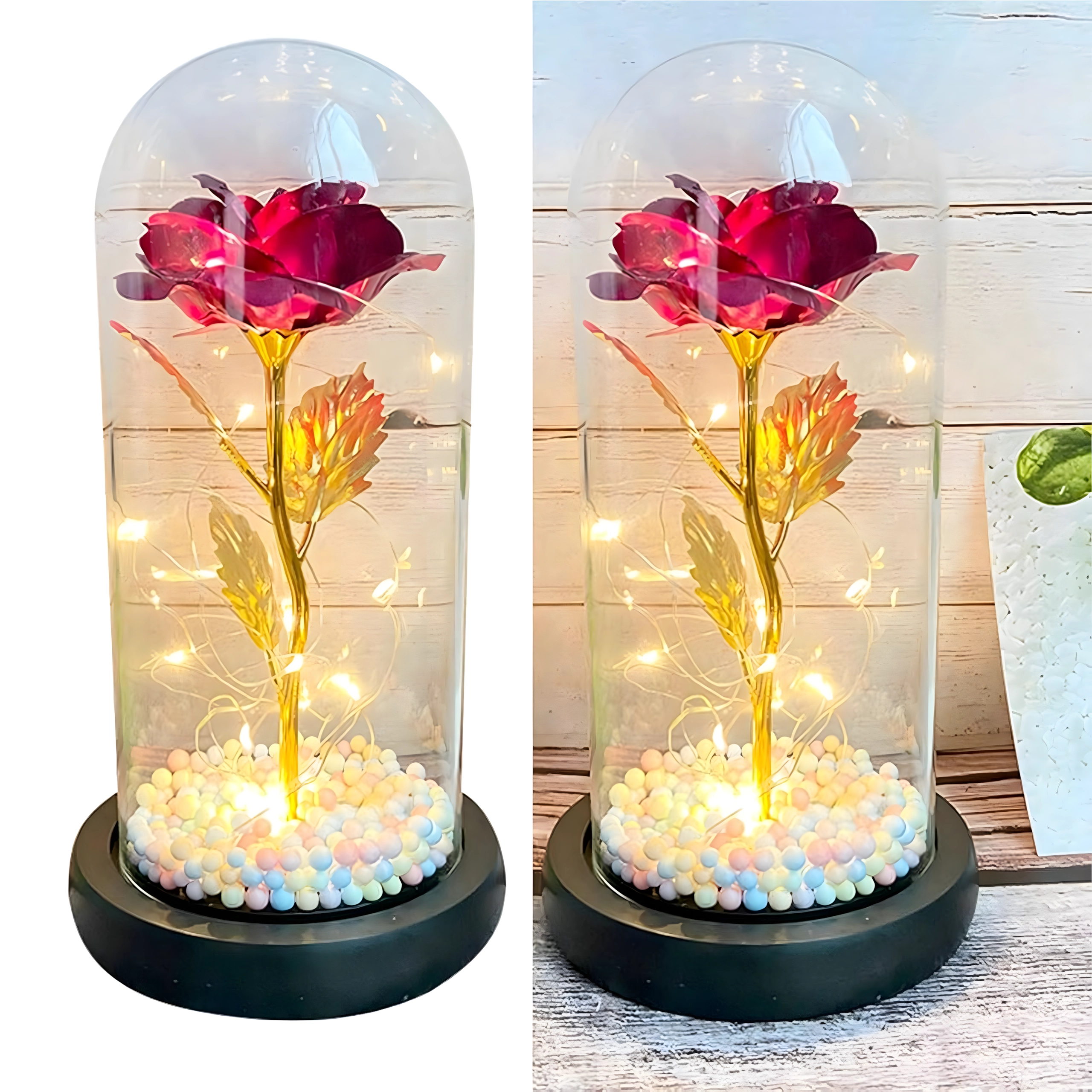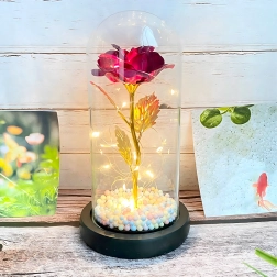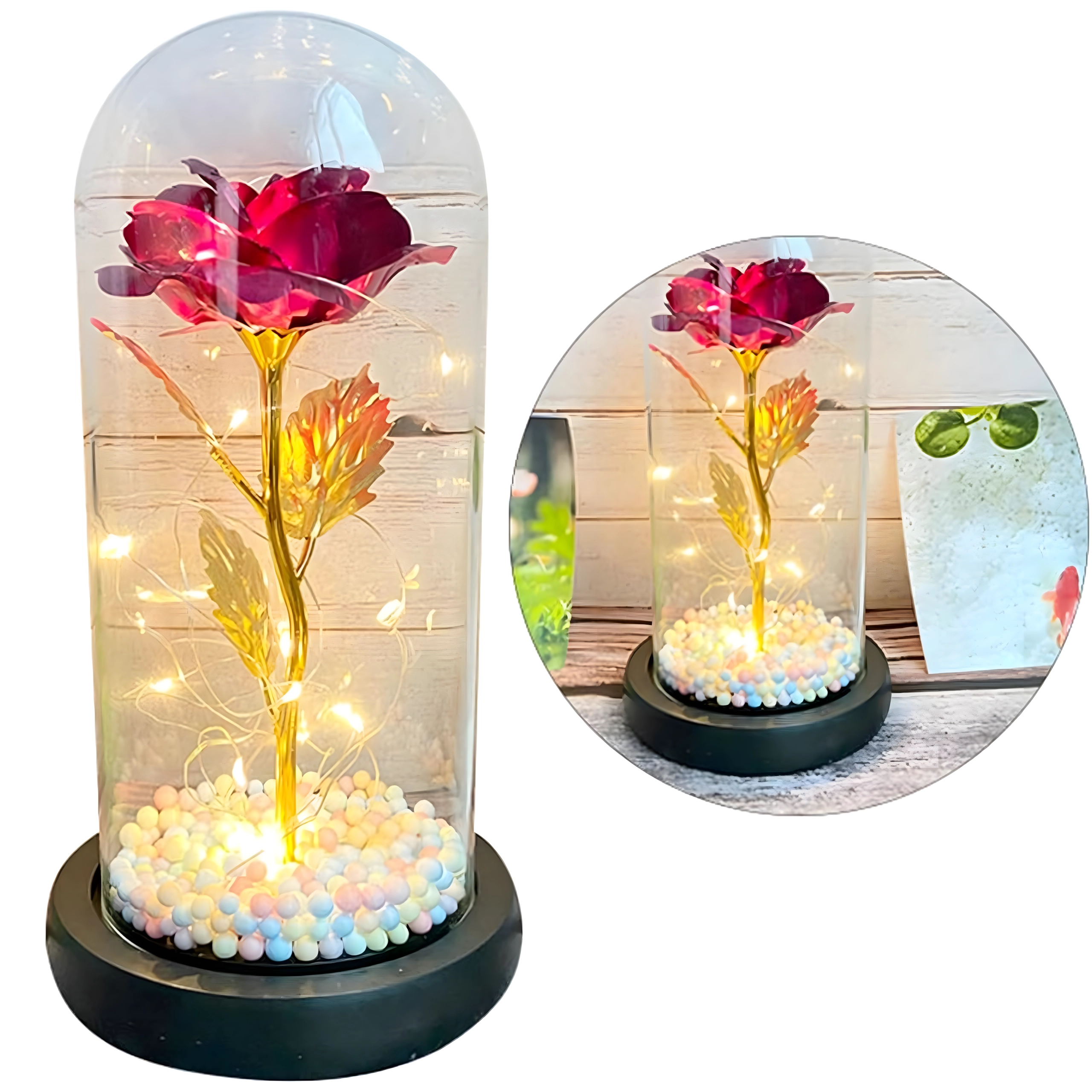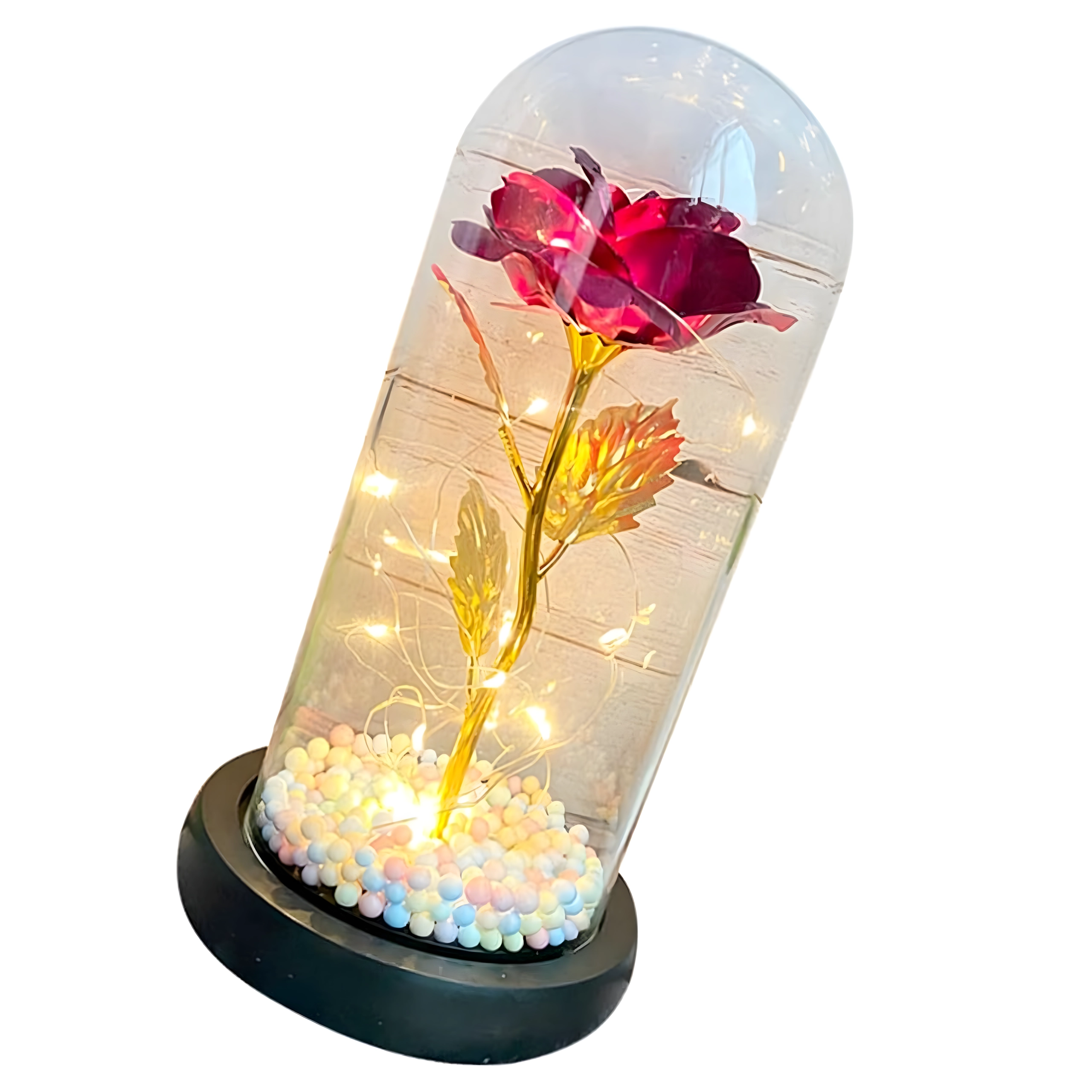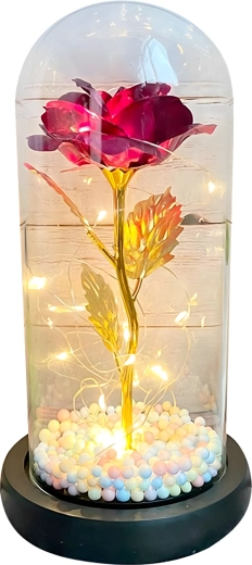 Une décoration envoûtante qui associe la beauté de la rose et une lumière chaleureuse. La cloche en verre protège la fleur de la poussière, tandis que la guirlande LED crée de doux reflets sur la tige et les feuilles dorées. Des perles colorées/pastel dans le socle ajoutent une touche délicate et ludique.