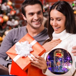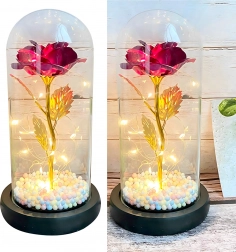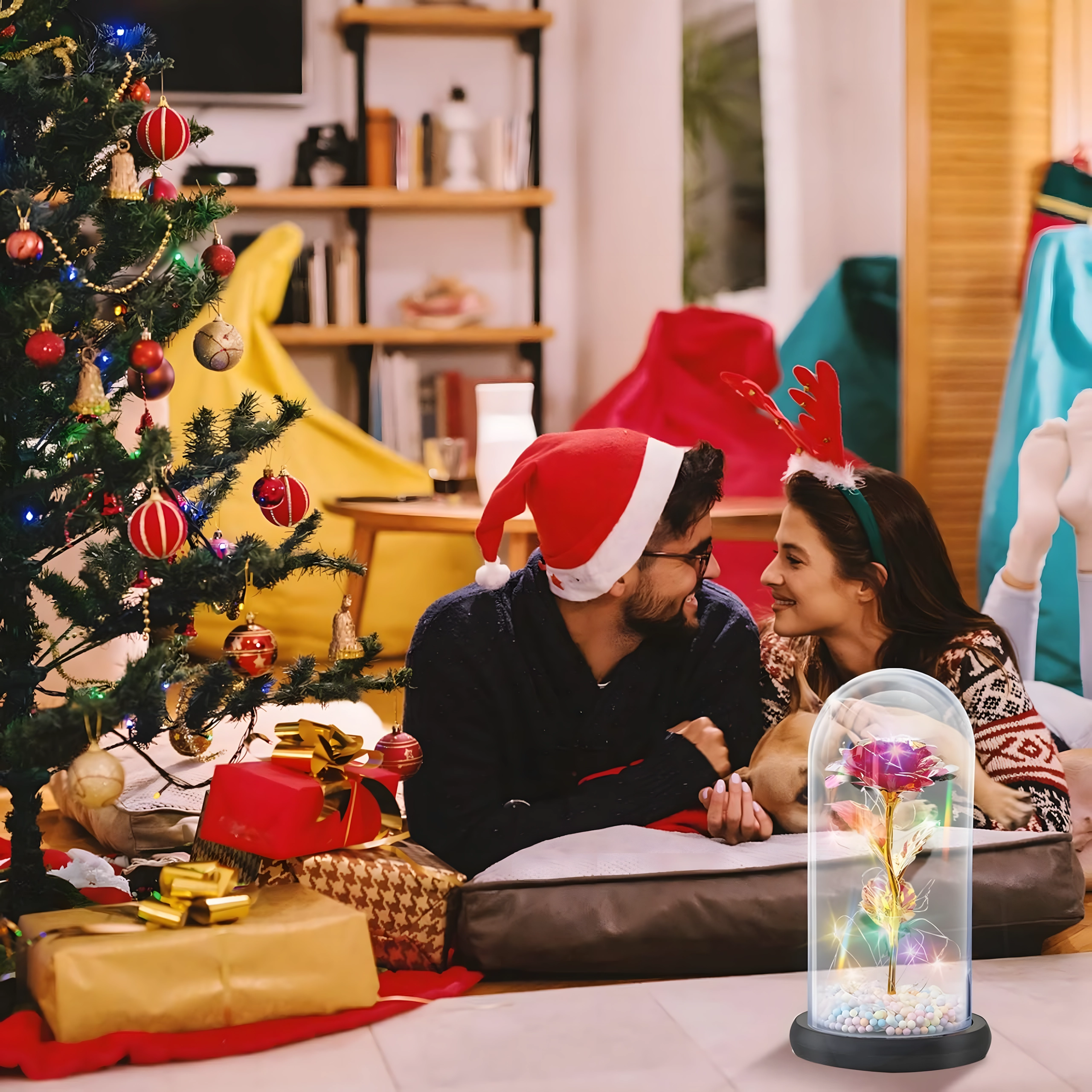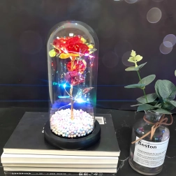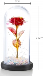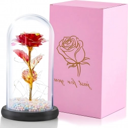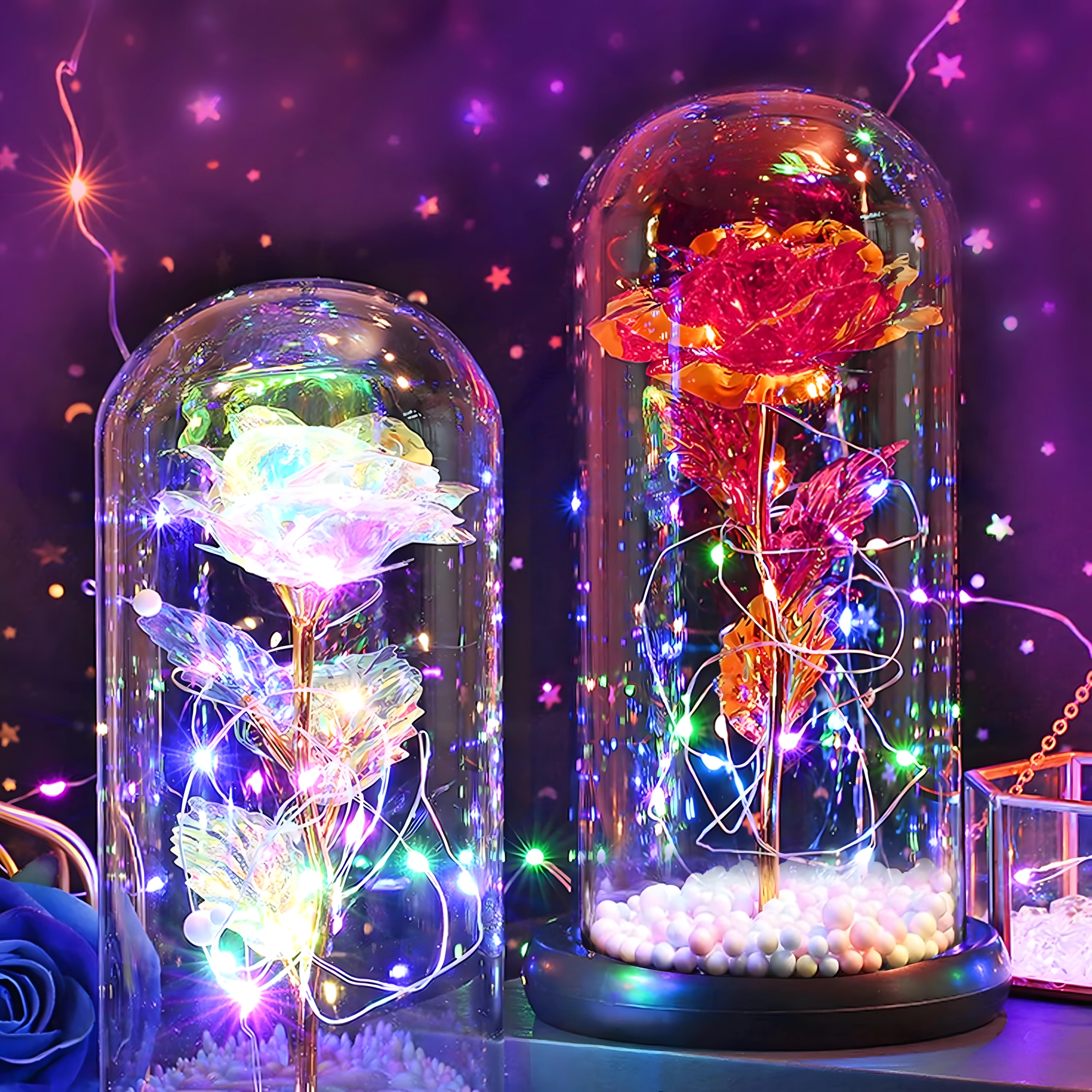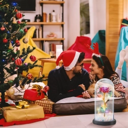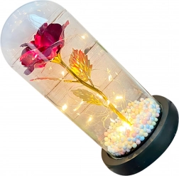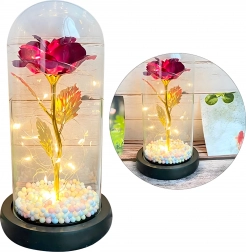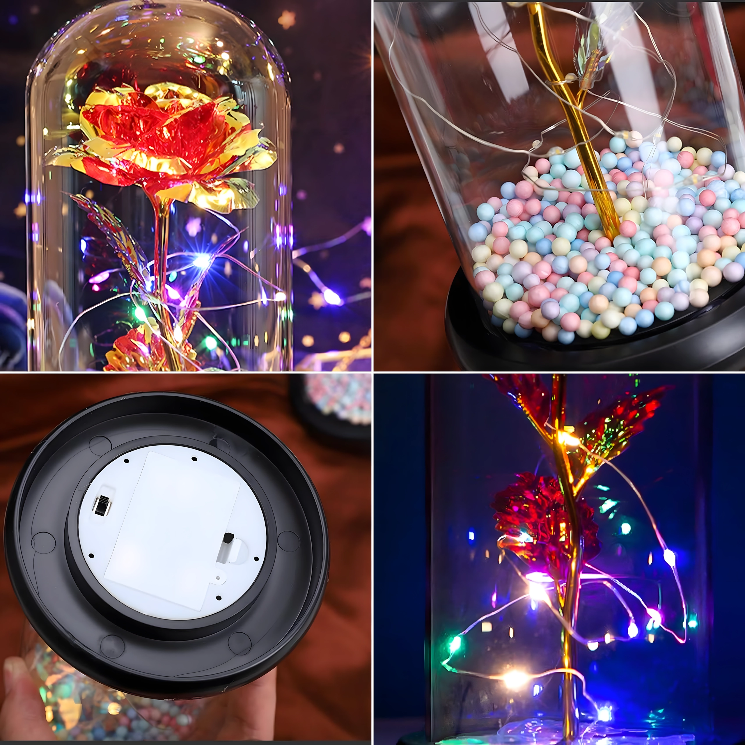 Une décoration envoûtante qui associe la beauté de la rose et une lumière chaleureuse. La cloche en verre protège la fleur de la poussière, tandis que la guirlande LED crée de doux reflets sur la tige et les feuilles dorées. Des perles colorées/pastel dans le socle ajoutent une touche délicate et ludique.