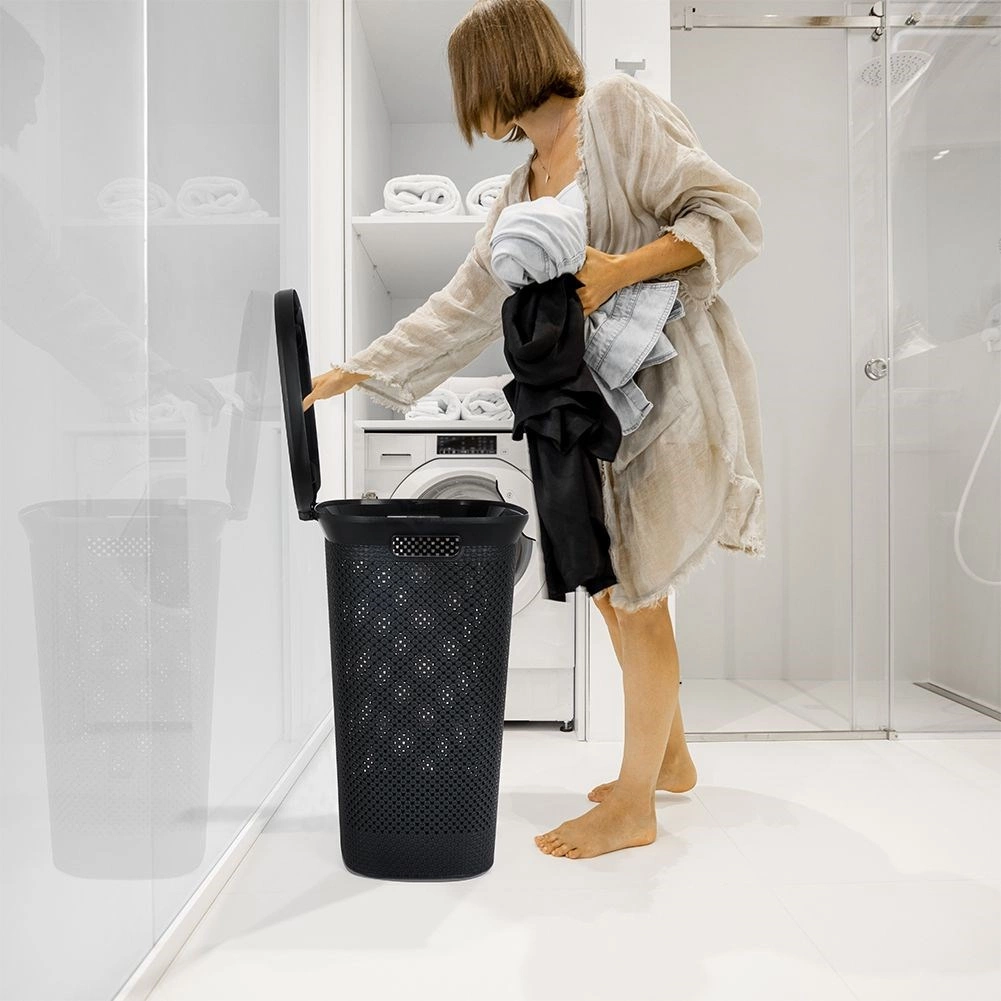 Ce panier à linge spacieux allie fonctionnalité et élégance. Le couvercle refermable garde le linge hors de vue et les parois perforées assurent une circulation de l’air limitant les mauvaises odeurs. Sa structure légère mais résistante se transporte aisément grâce aux poignées latérales intégrées.