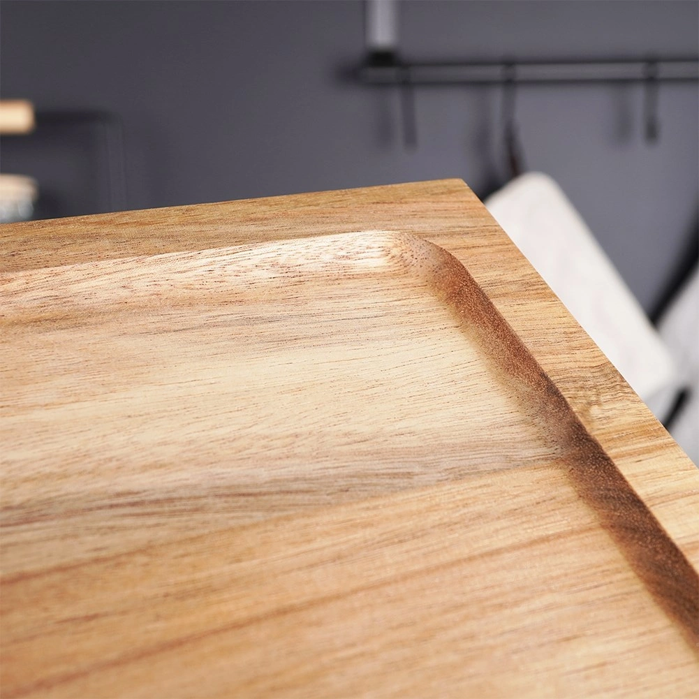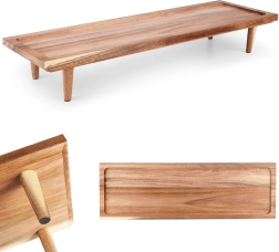 Cette planche de service polyvalente avec pieds se distingue par son design épuré et sa fonctionnalité. Grâce au bois d’acacia robuste, elle résiste à l’humidité et aux déformations, idéale pour un usage quotidien en cuisine comme lors des réceptions. Les bords rehaussés maintiennent les aliments en place et facilitent le transport.