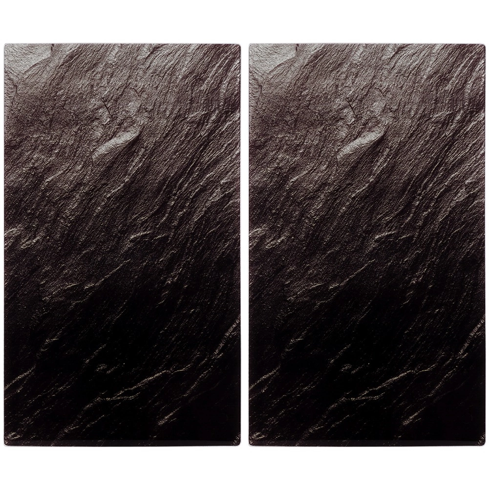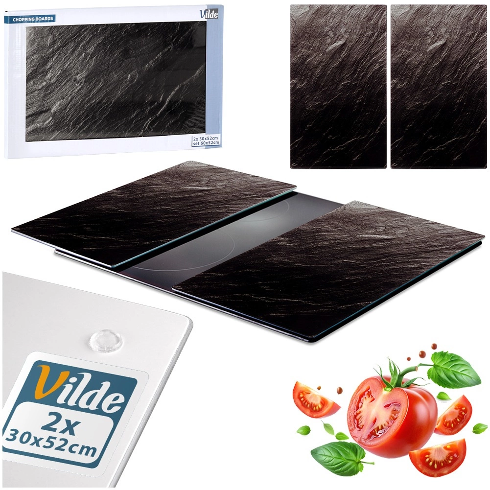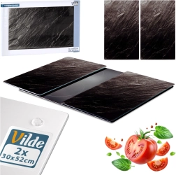 Ce set en deux parties allie style et fonctionnalité. Chaque plaque mesure 52 × 30 × 0,4 cm et, ensemble, elles offrent une grande surface de 60 × 52 cm, utilisable pour la découpe, le service ou comme cache pour plaque de cuisson. Le verre trempé à l’aspect pierre noire apporte une touche moderne à la cuisine tout en protégeant les surfaces des dommages.