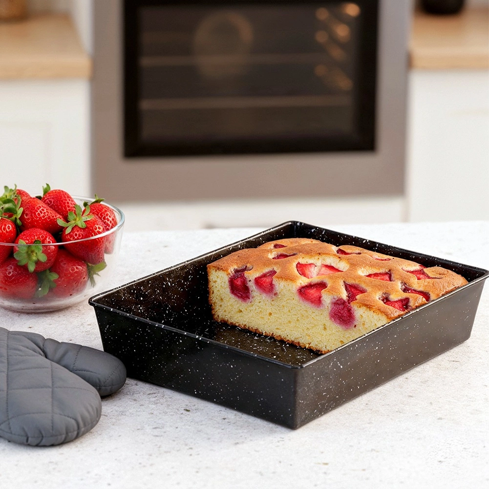 Moule à pâtisserie universel en granit, en acier au carbone résistant, pour une cuisson parfaitement homogène. Grâce au revêtement granit antiadhésif, la pâte se démoule facilement et le moule se nettoie aisément. Idéal pour les gâteaux, gratins, viandes et légumes, sûr au four jusqu’à 230 °C.