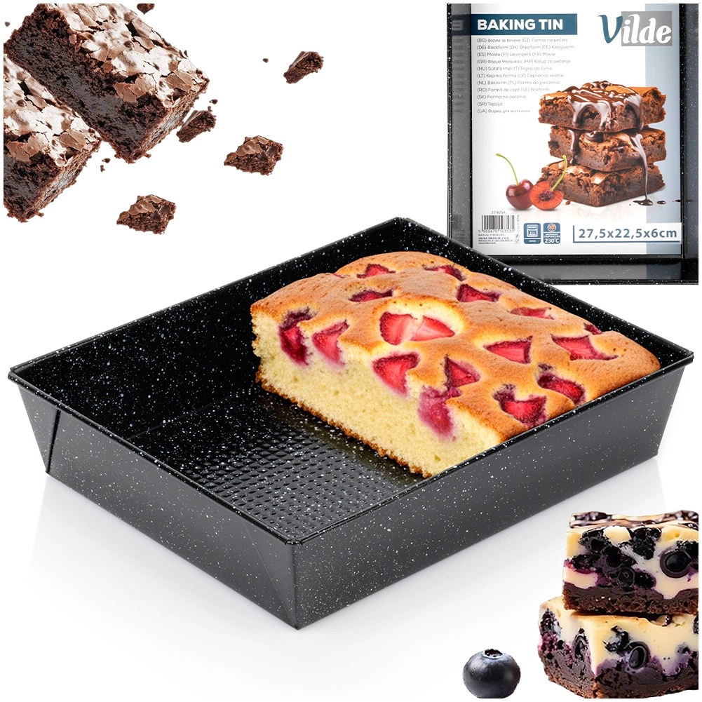 Pratique, le moule rectangulaire de 27,5 × 22,5 × 6 cm est un excellent choix pour la pâtisserie du quotidien comme pour les menus de fête. L’acier au carbone conduit remarquablement la chaleur, assurant une cuisson uniforme et des résultats fiables pour le sucré comme pour le salé.