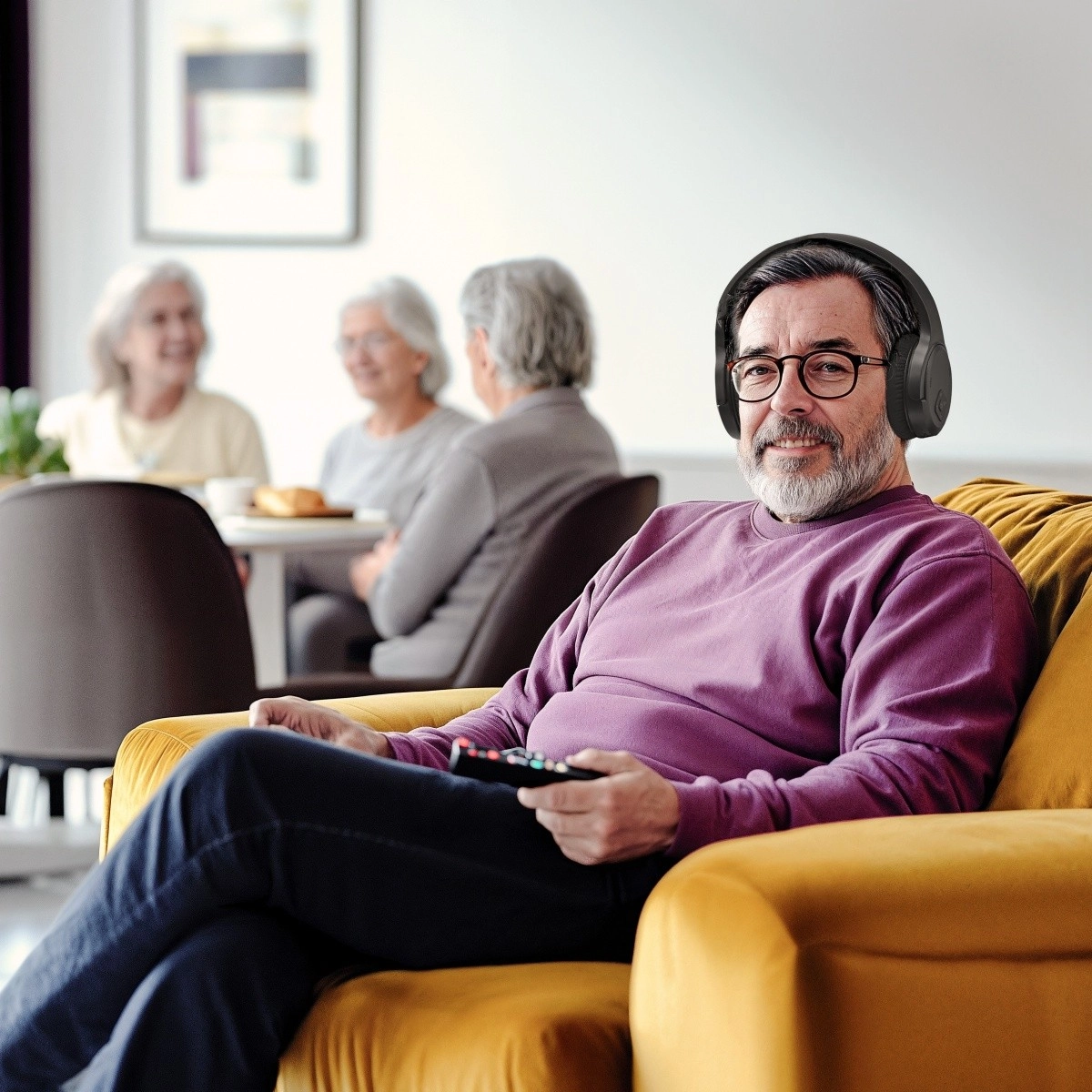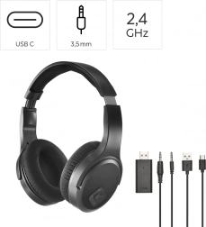Le casque sans fil pour TV offre un son clair et synchronisé grâce à la transmission 2,4 GHz sans latence. Il suffit de brancher la clé USB‑A au téléviseur pour une connexion automatique. La conception circum-aurale fermée avec réduction passive du bruit isole des bruits ambiants pour une écoute sans distraction.