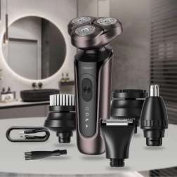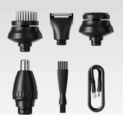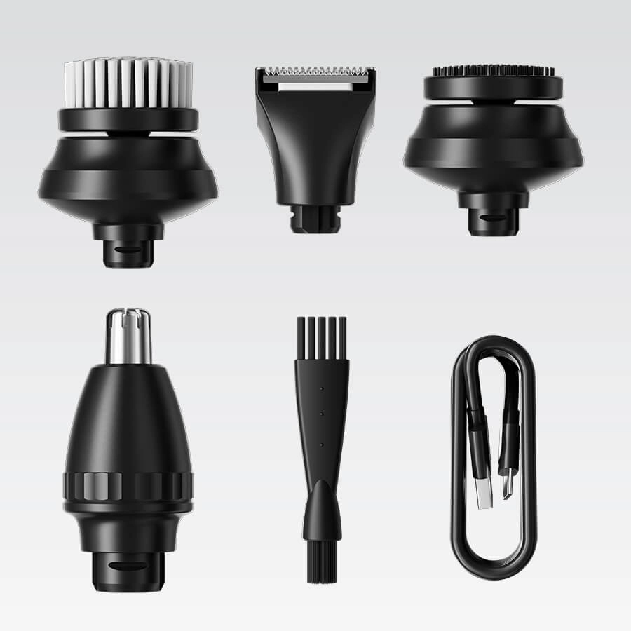 Le kit comprend une tête de rasage, un tondeuse pour poils du nez et des oreilles, une brosse nettoyante pour le visage, un accessoire de massage et une tondeuse à cheveux avec 3 sabots (3/5/7 mm) pour un réglage précis de la longueur. Deux niveaux de vitesse améliorent le confort et l’efficacité selon le type de barbe.