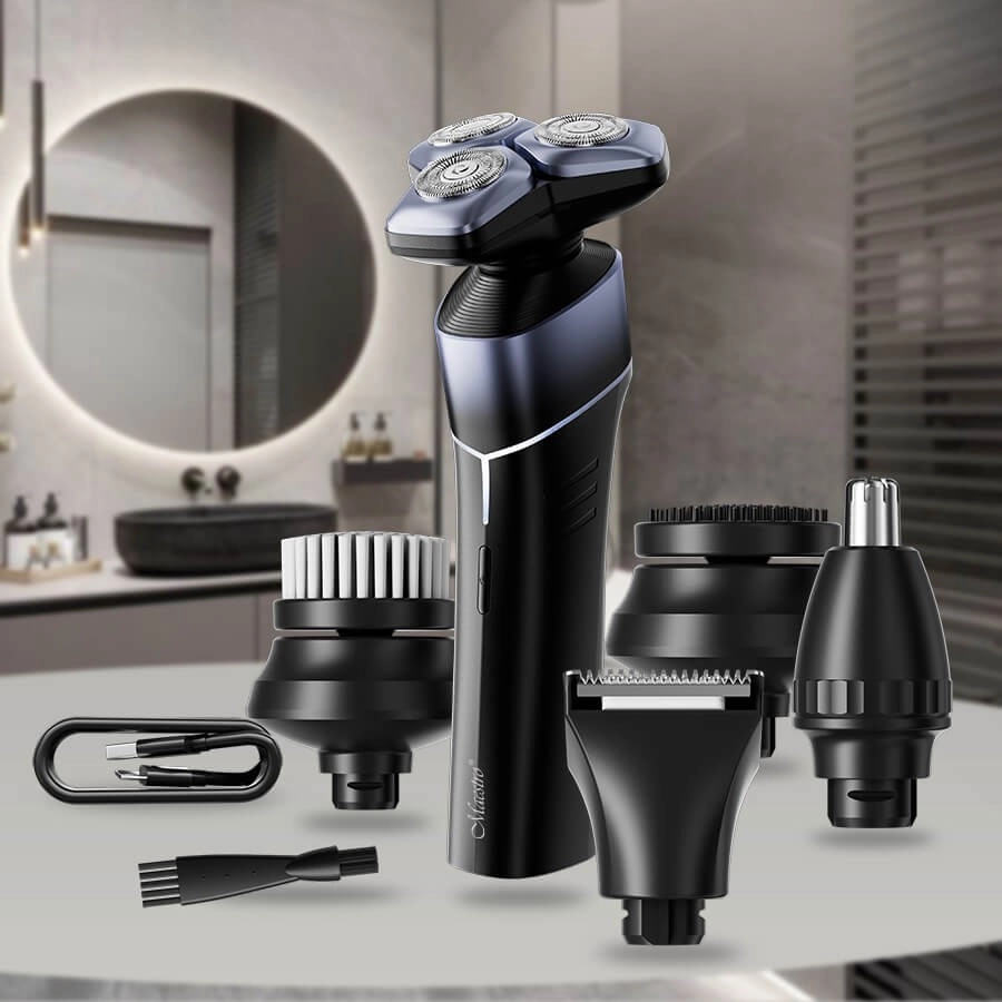 Set multifonction pour l’homme moderne : MAESTRO 5‑en‑1 combine rasage de près, taille des cheveux et de la barbe, tondeuse nez et oreilles, brosse nettoyante pour le visage et embout de massage. Grâce à sa batterie 600 mAh, à la charge USB‑C, à son corps étanche IPX7 et à une autonomie jusqu’à 60 minutes, il est idéal pour la salle de bain comme en voyage.