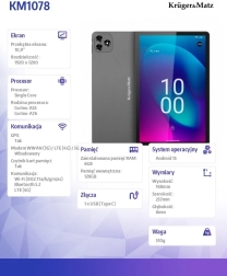 La tablette moderne KRÜGER&MATZ Eagle 1078S offre un écran IPS 11" avec une résolution de 1920 × 1200, une fluidité 90 Hz, un processeur MediaTek octa‑cœur et 8 Go de RAM pour travailler et se divertir en toute rapidité. Avec un stockage de 256 Go (extensible via microSD), la LTE, le Wi‑Fi ac, le Bluetooth 5.2 et une batterie de 7000 mAh, elle est prête pour une utilisation toute la journée, les appels vidéo et les contenus multimédias.