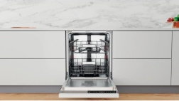 Des fonctions astucieuses comme les paniers supérieurs réglables, les picots rabattables et un tiroir ou panier à couverts dédié facilitent l’organisation de l’espace intérieur. Le contrôle tactile intuitif sur la tranche de la porte et des indicateurs clairs simplifient la sélection des programmes et des options, y compris les modes économiques.