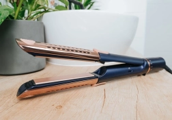Le styling est doux et efficace grâce aux plaques de lissage céramiques à diffusion homogène de la chaleur et aux plaques flottantes qui s’adaptent à l’épaisseur de la mèche sans tirer. La partie extérieure des pinces bénéficie d’un revêtement titane pour une plus grande résistance et une longue durée de vie. La température se règle en cinq niveaux 140 / 160 / 180 / 200 / 220 °C selon le type de cheveux ; à la température la plus basse, l’appareil est prêt en 30 secondes.