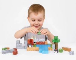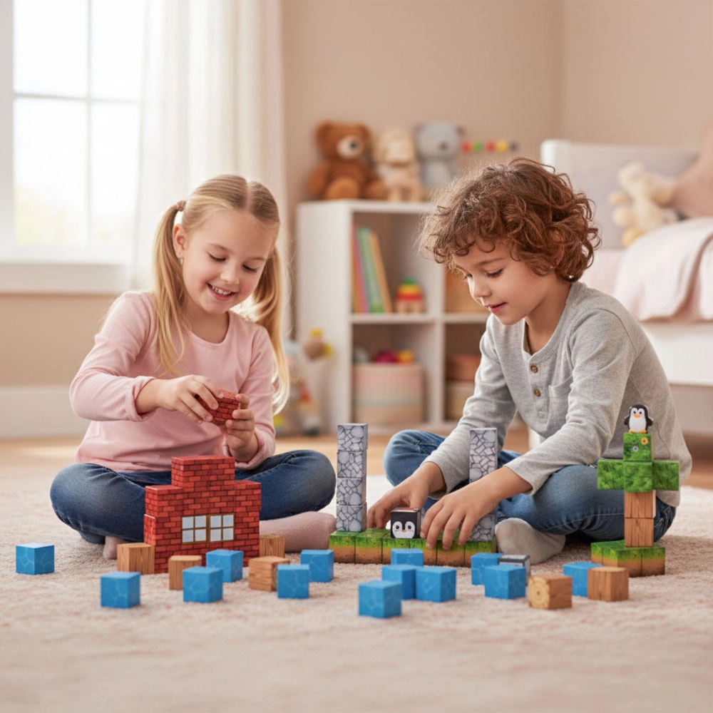 Ce set de cubes magnétiques colorés permet aux enfants de construire des tours, des maisonnettes, des ponts et même des paysages en voxels. Grâce aux aimants intégrés, les pièces s’assemblent rapidement et sûrement de tous les côtés – sans frustration et avec un succès immédiat. Les cubes avec motifs d’herbe, de bois, de pierre et d’eau favorisent le jeu créatif et la création de scènes thématiques.