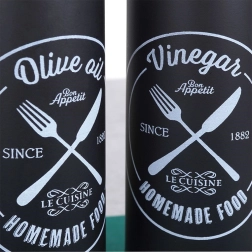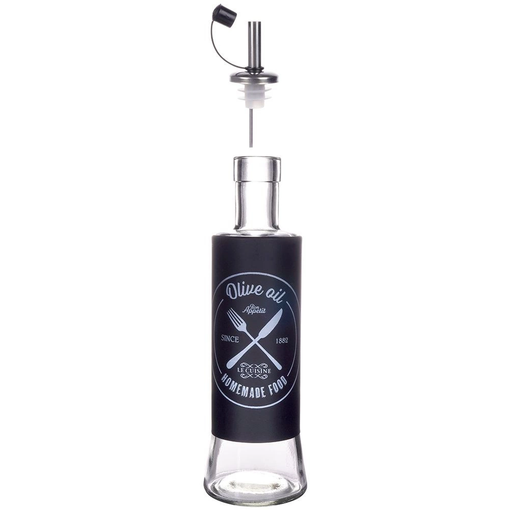 Ensemble élégant de deux bouteilles en verre de 300 ml pour l’huile d’olive et le vinaigre, avec bec verseur en métal et capuchon de protection. Offre un dosage précis, un versement anti-goutte et un design noir moderne avec inscriptions blanches pour une identification facile. Idéal pour la cuisine et la restauration.