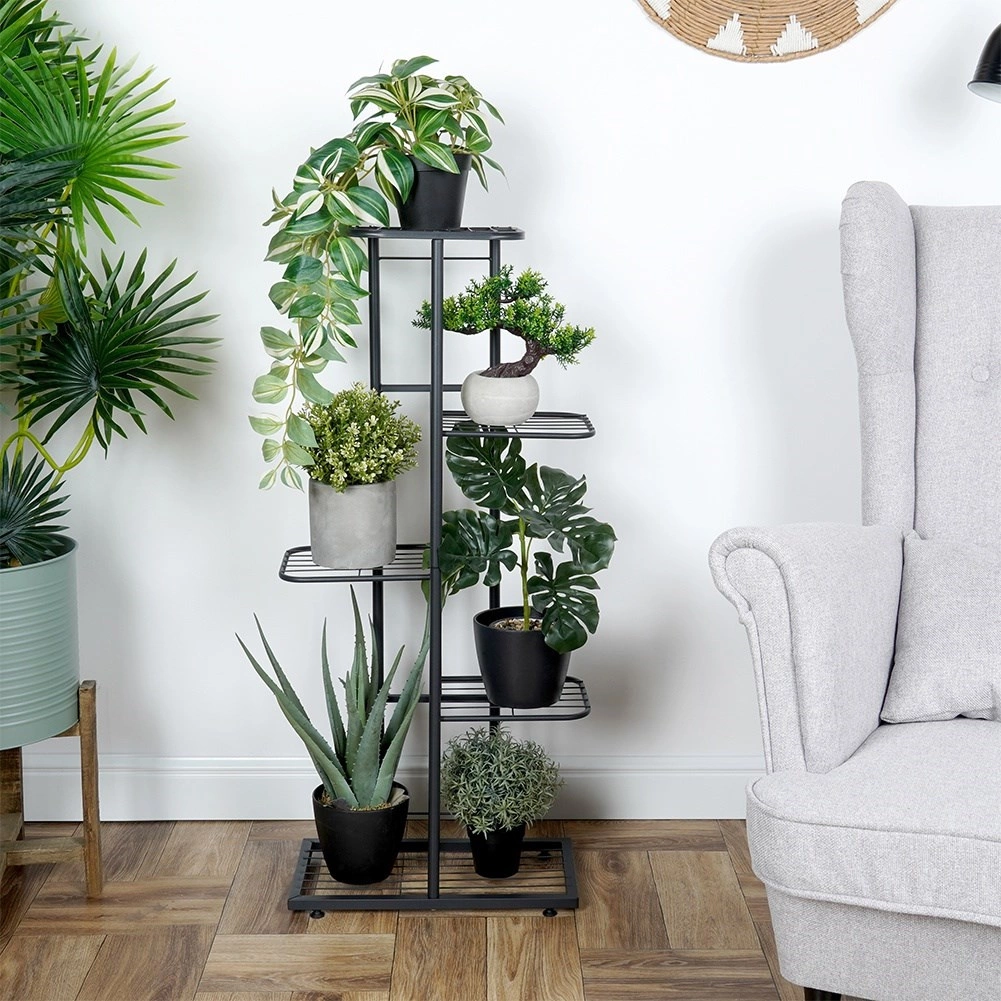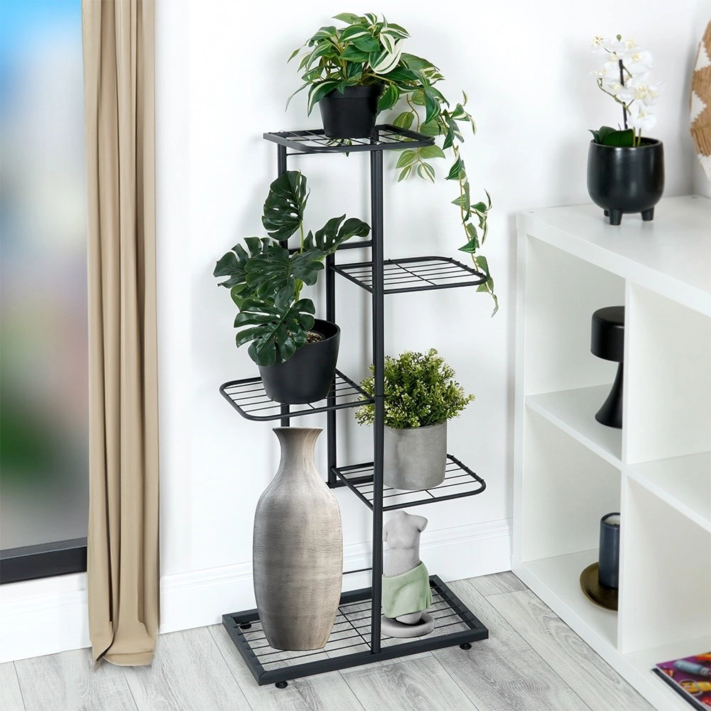 Cinq niveaux d’étagères permettent de créer une composition végétale généreuse sans encombrer le sol. Idéal près d’une fenêtre, dans un coin du salon ou sur un balcon couvert.