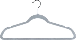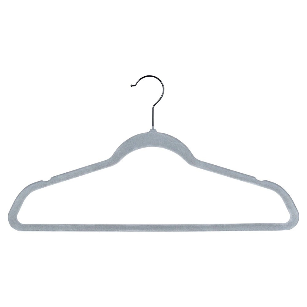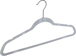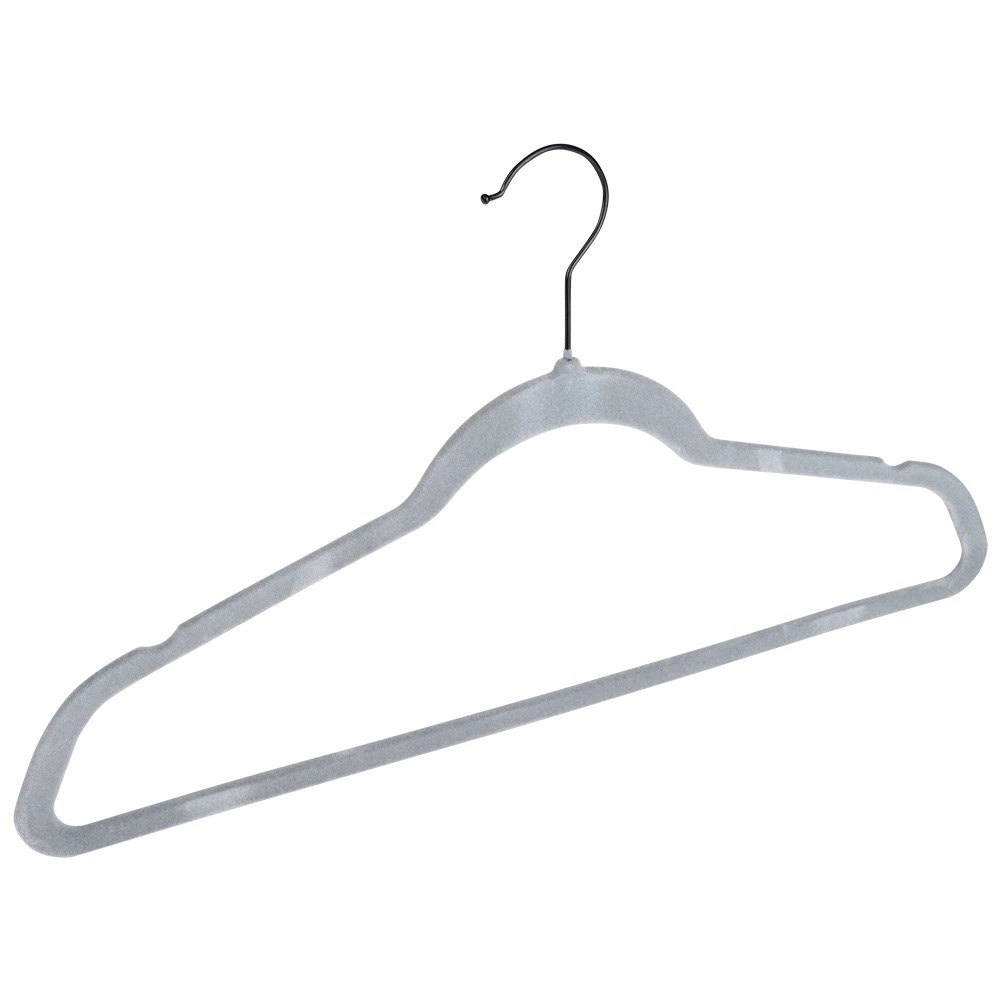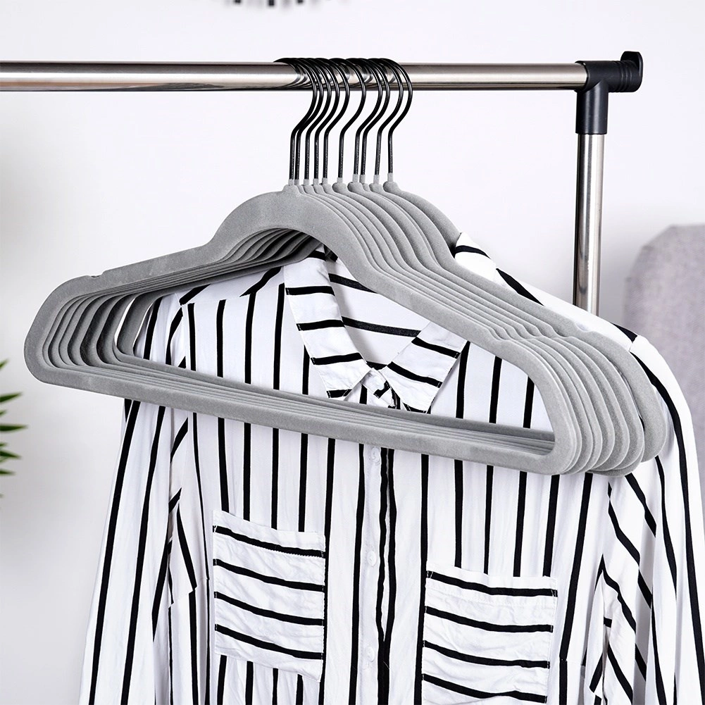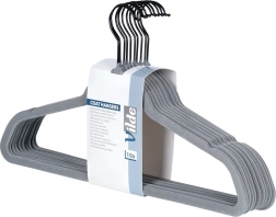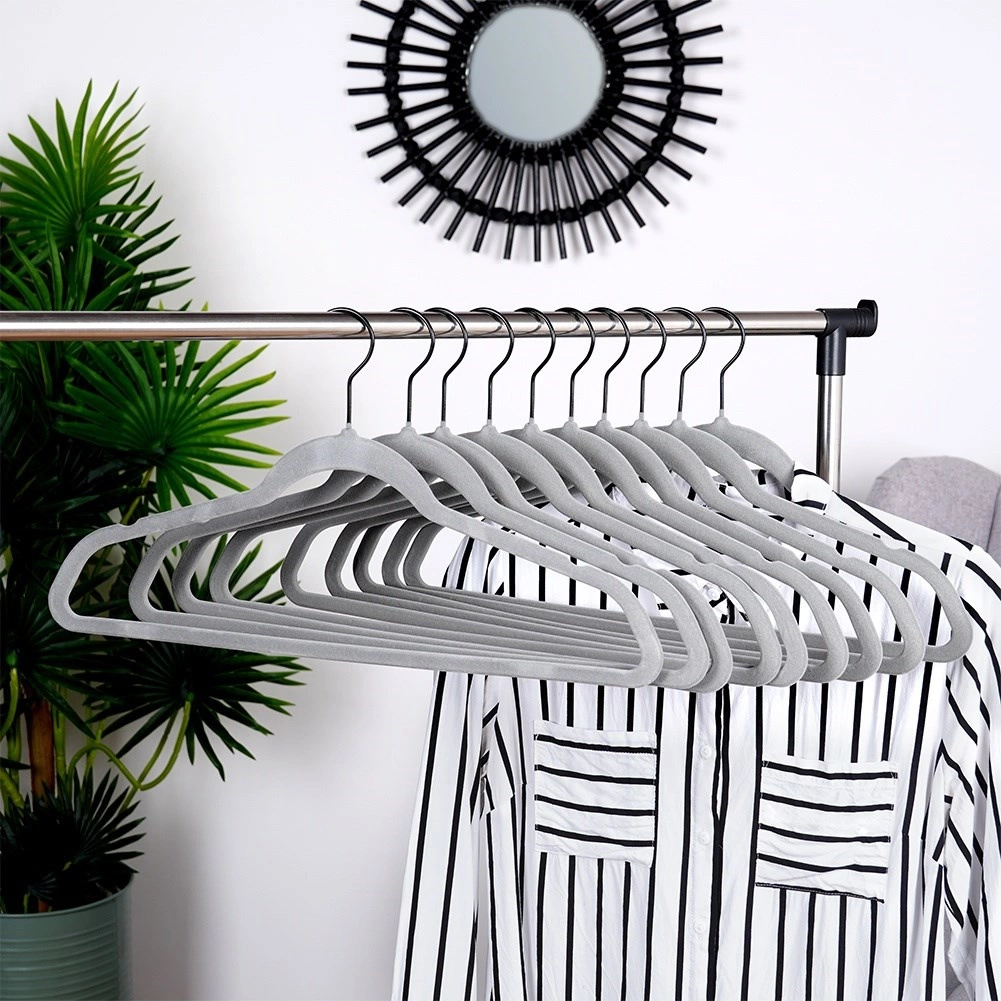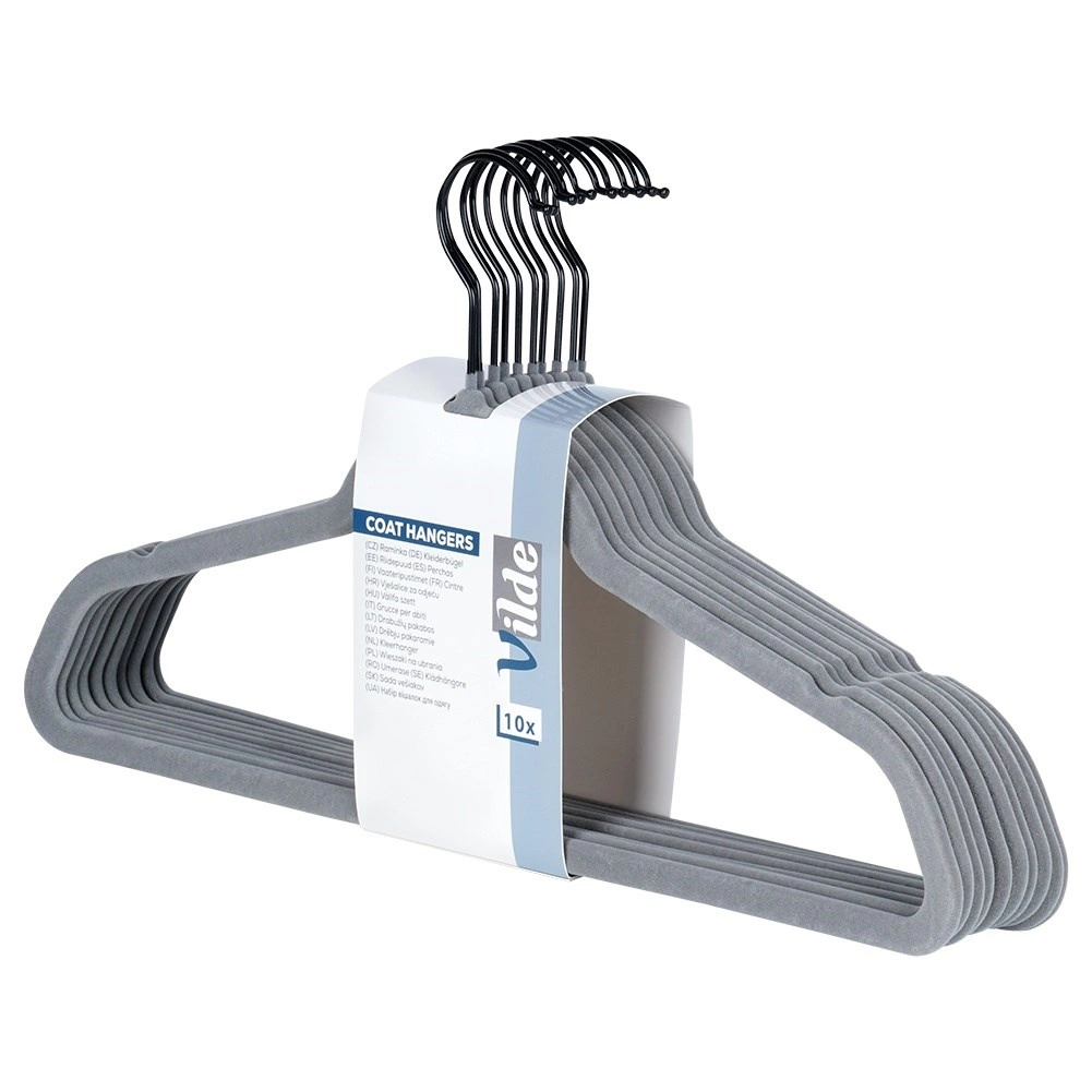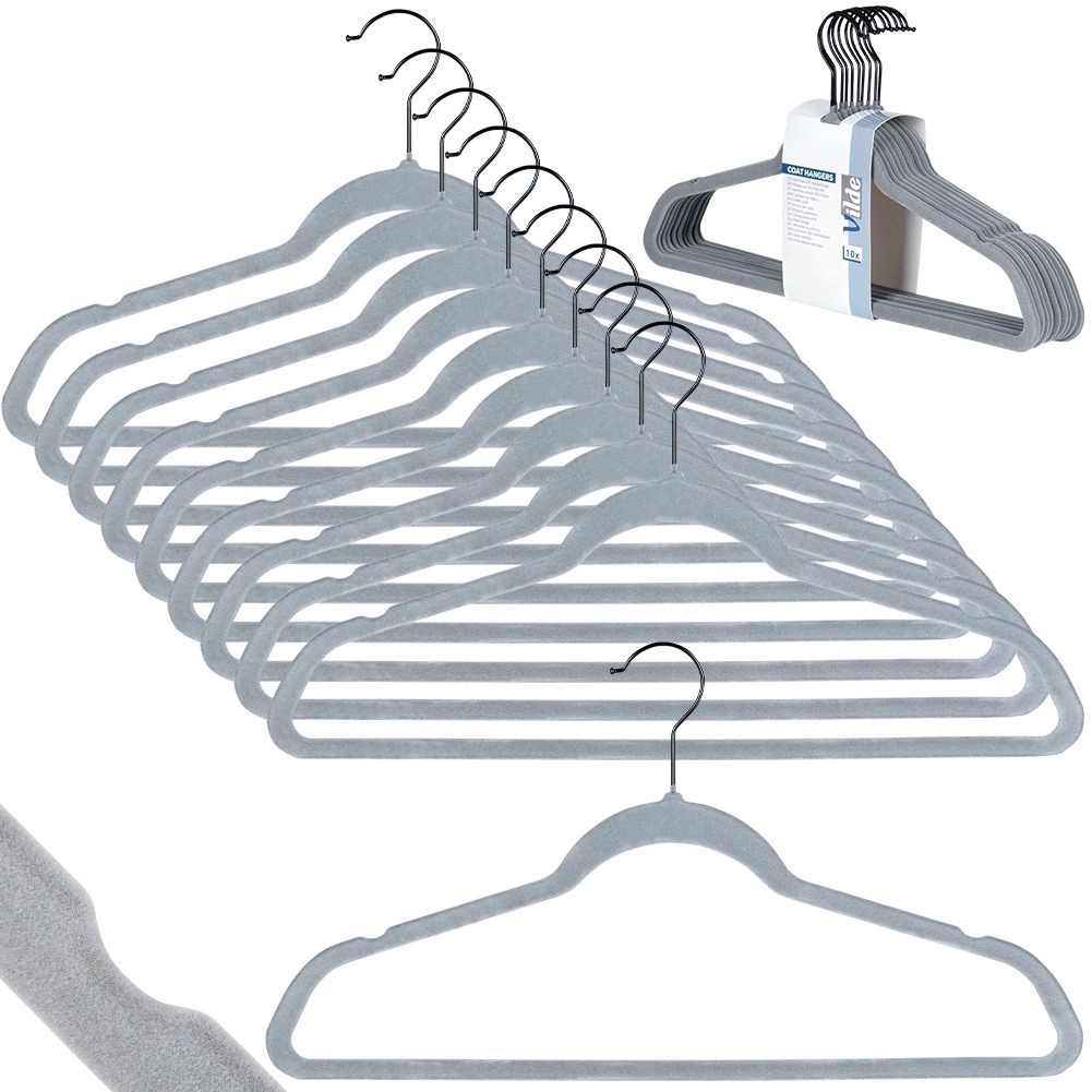 Cintres en velours gris Vilde qui économisent de la place et maintiennent les vêtements sans glisser. Velours antidérapant, crochet métallique pivotant et taille universelle 45 × 24,5 cm pour chemises, robes et manteaux. Lot de 10 pratique pour organiser facilement votre armoire.