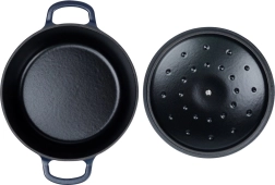 - Design: extérieur bleu foncé, intérieur émaillé noir – accessoire pratique et élégant pour la cuisson.