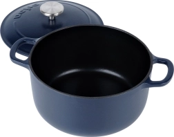 Cette cocotte en fonte LITINA de 22 cm allie matériau traditionnel et finition moderne. La fonte épaisse conduit et retient remarquablement la chaleur, tandis que l’intérieur émaillé lisse minimise l’adhérence et simplifie l’entretien. L’extérieur bleu foncé apporte du style à votre cuisine et la cocotte peut passer directement à table – la fonte maintient les plats au chaud plus longtemps.