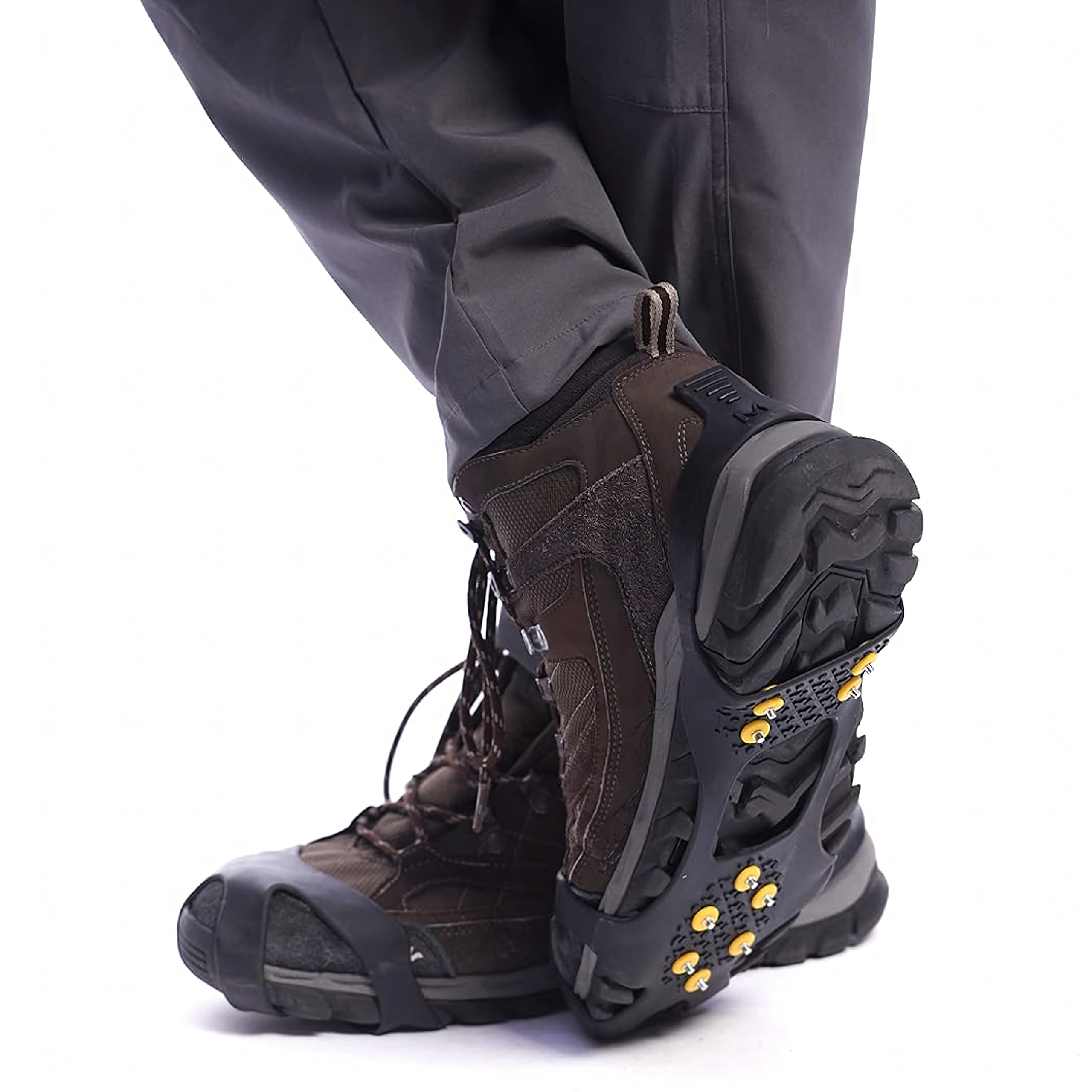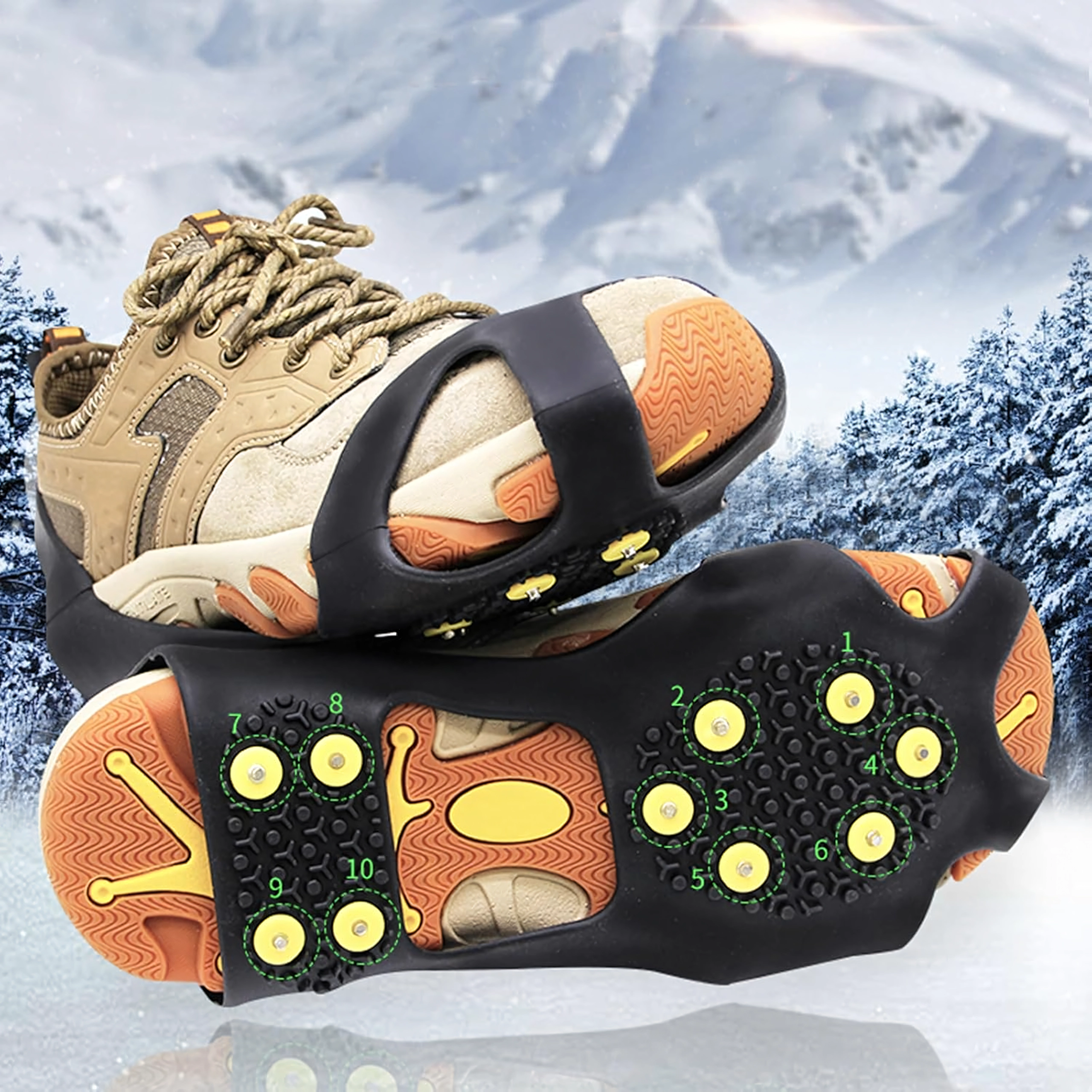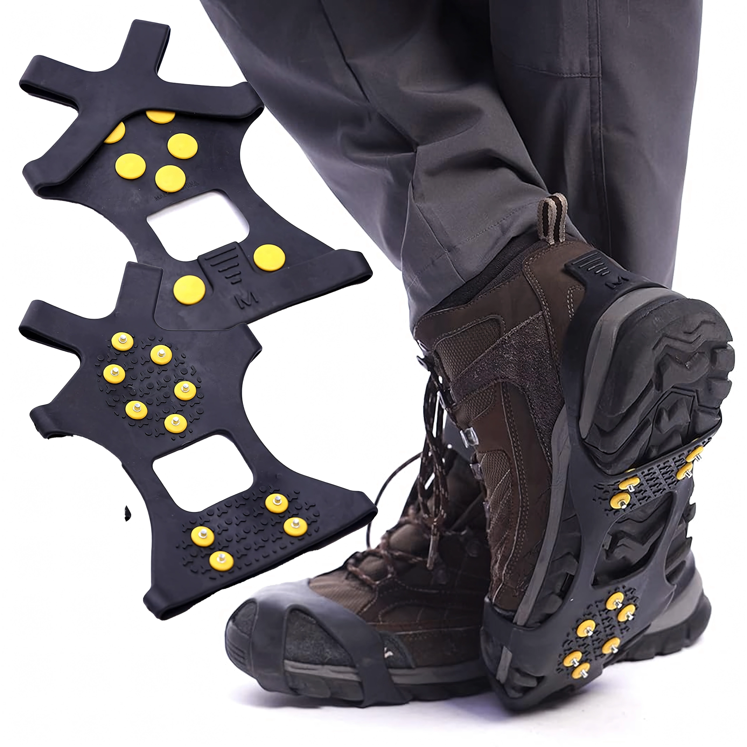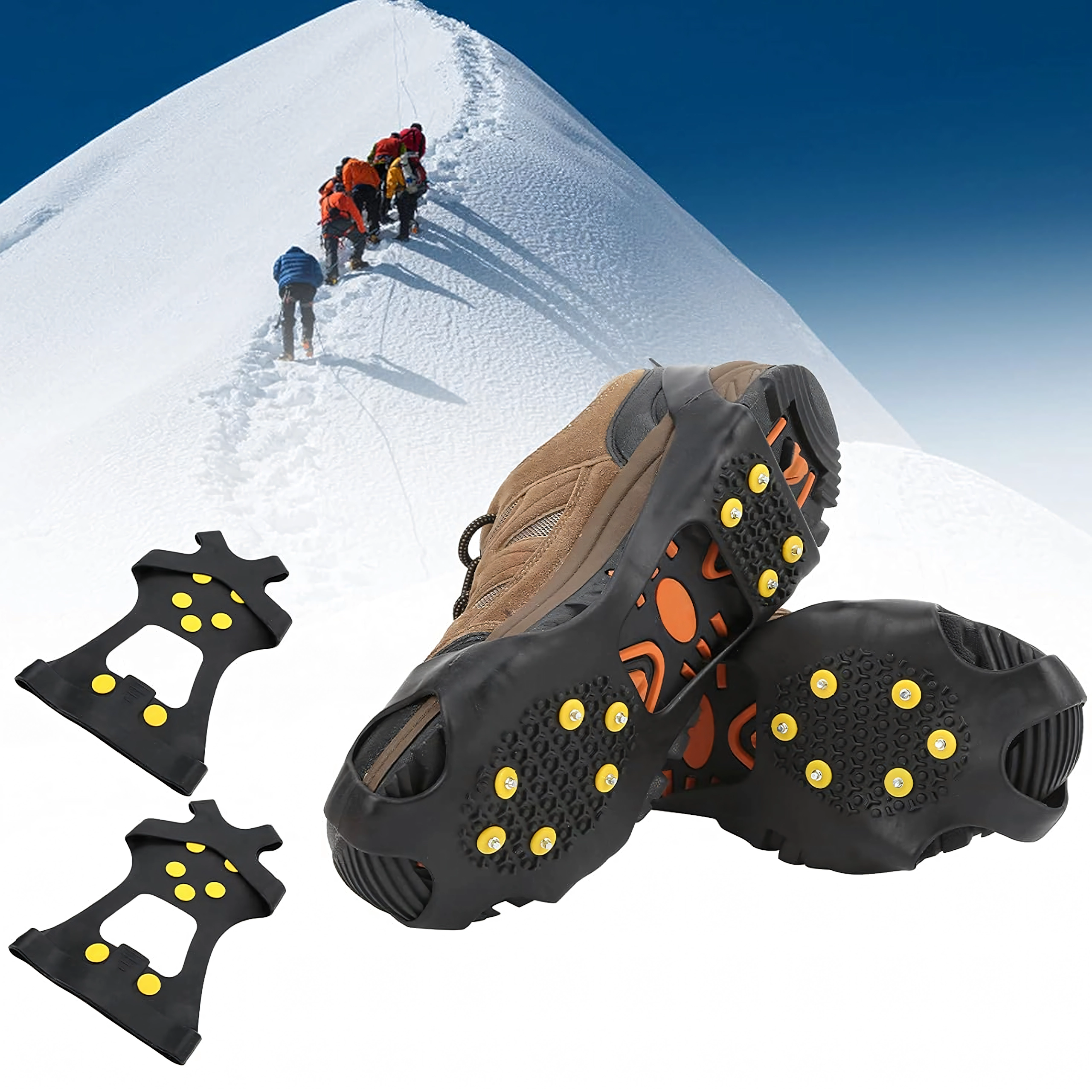 Crampons antidérapants fiables avec pointes métalliques pour une marche sûre sur la neige, la glace et la boue. Fabriqués en caoutchouc TPE résistant et en métal, ils offrent une excellente adhérence, une stabilité et un enfilage facile. 10 pointes métalliques assurent une sécurité à chaque pas ; les crampons sont légers, élastiques et compacts – idéals pour la randonnée, le travail en extérieur et la marche hivernale au quotidien.