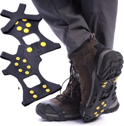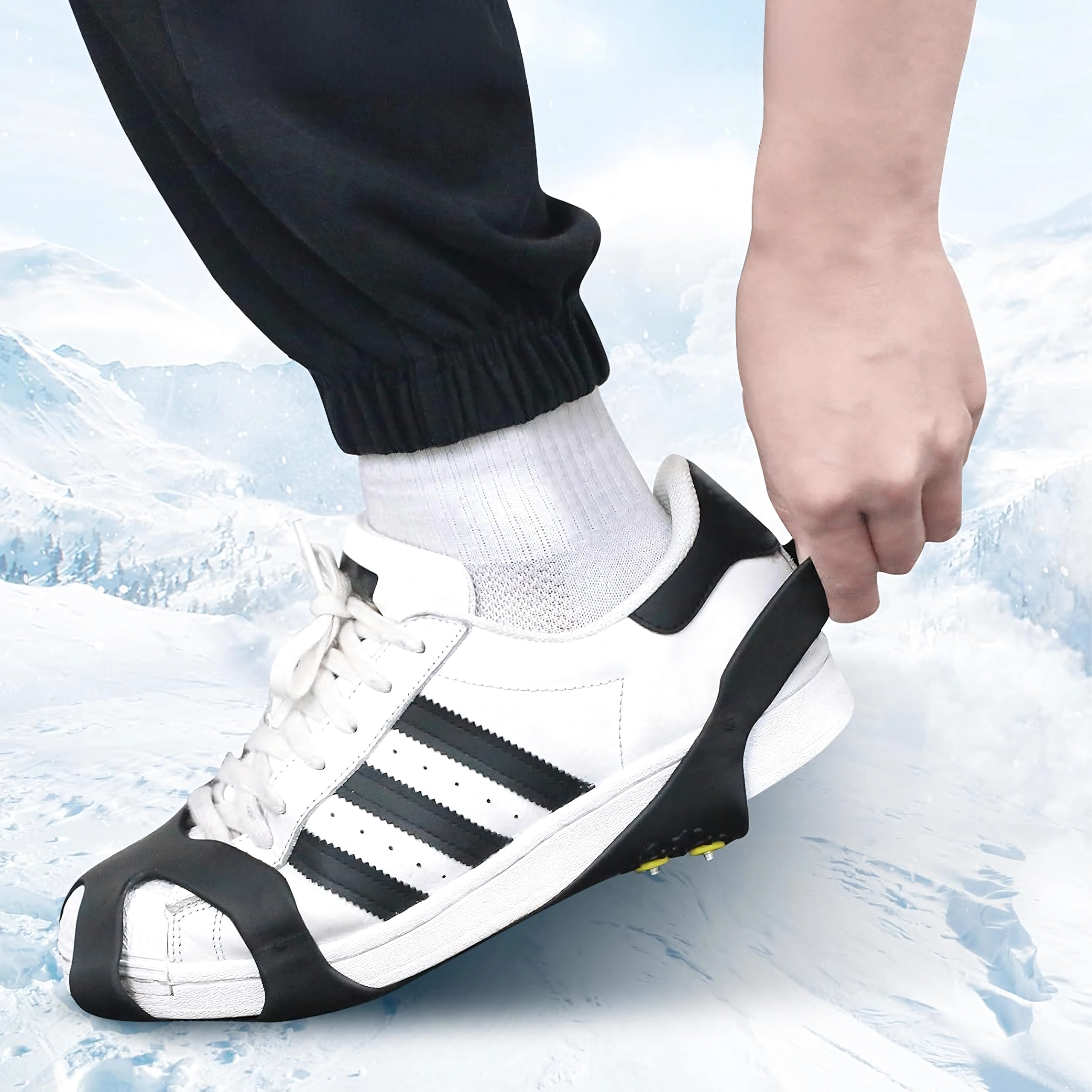 Vous cherchez un moyen simple d’accroître la sécurité de votre marche en hiver ? Ces crampons antidérapants avec 10 pointes métalliques complètent la semelle de vos chaussures par une traction marquée sur la glace, la neige tassée et les surfaces détrempées. Le matériau TPE, robuste mais flexible, s’enfile facilement par-dessus l’avant et le talon, reste bien en place et ne glisse pas.