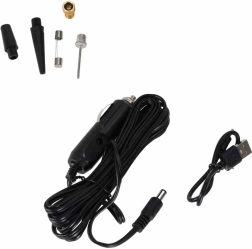 - pompe électrique/mini compresseur, tuyau, 5× embout interchangeable, câble USB, câble pour allume‑cigare, manuel