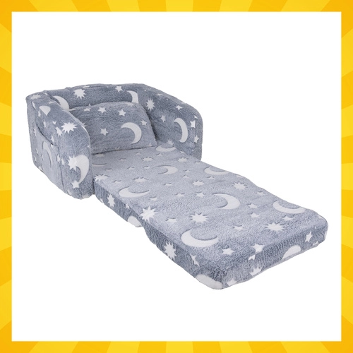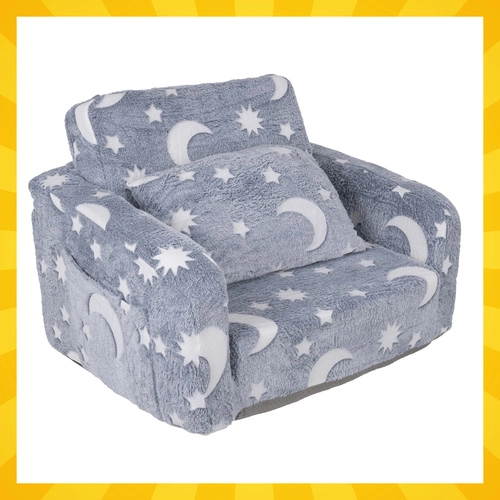 Douceur et plaisir réunis – le fauteuil enfant pliant Kruzzel se transforme facilement en chaise longue pour lire, se détendre ou écouter des histoires. Ultra léger, sécurisé et facile à transporter, avec une pratique poche latérale et une douce housse en peluche. Les lunes et étoiles fluorescentes brillent délicatement dans l’obscurité et créent une atmosphère apaisante pour un endormissement serein.