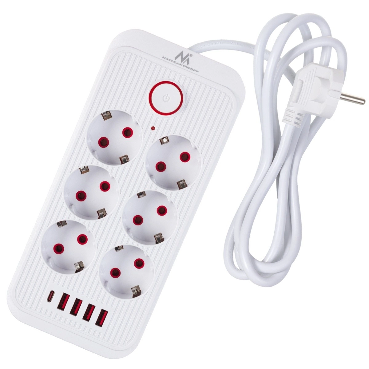 Multiprise parafoudre avec 6 prises et 5× USB (4× USB‑A, 1× USB‑C), 2500 W, blanc
