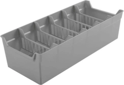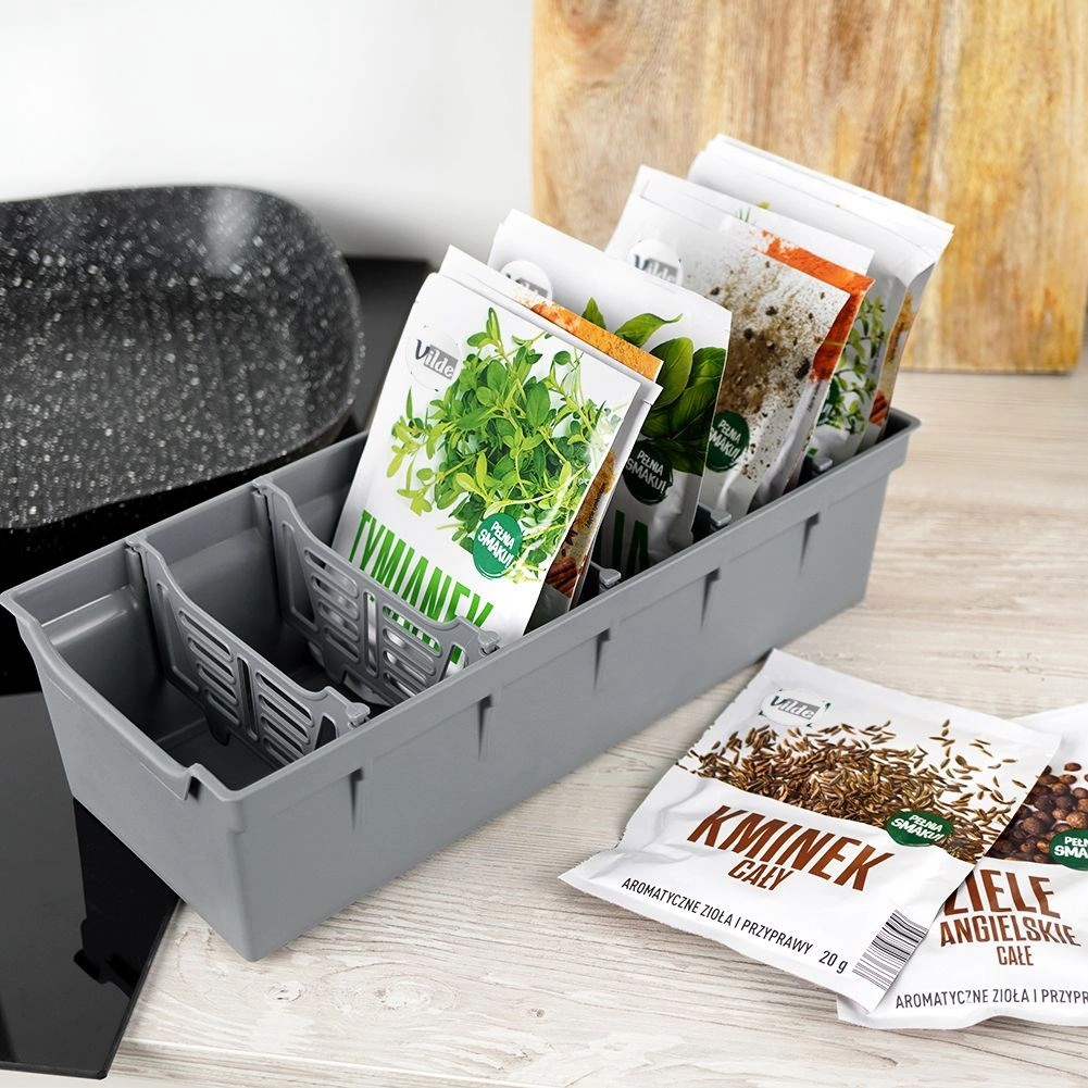 L’organisateur est fabriqué en plastique de qualité, résistant dans une élégante couleur grise. À l’intérieur, vous trouverez cinq cloisons amovibles qui divisent l’espace en six sections – vous créez ainsi facilement des zones pour différents types d’épices et trouvez rapidement exactement ce qu’il vous faut. Parfait non seulement pour les sachets fermés, mais aussi entamés.