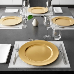 Ce dessous d’assiette rond doré est une base stylée pour tout dressage. Son large bord et son éclat métallique marqué subliment instantanément l’allure des assiettes, des verres et des couverts, tout en protégeant la surface de la table de la chaleur et des taches. Idéal pour un usage quotidien comme pour les grandes occasions.