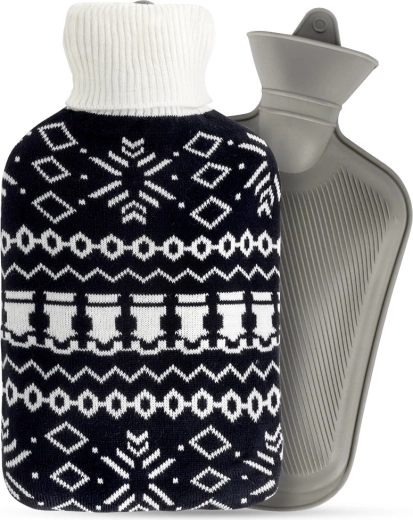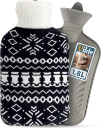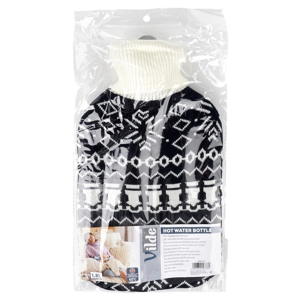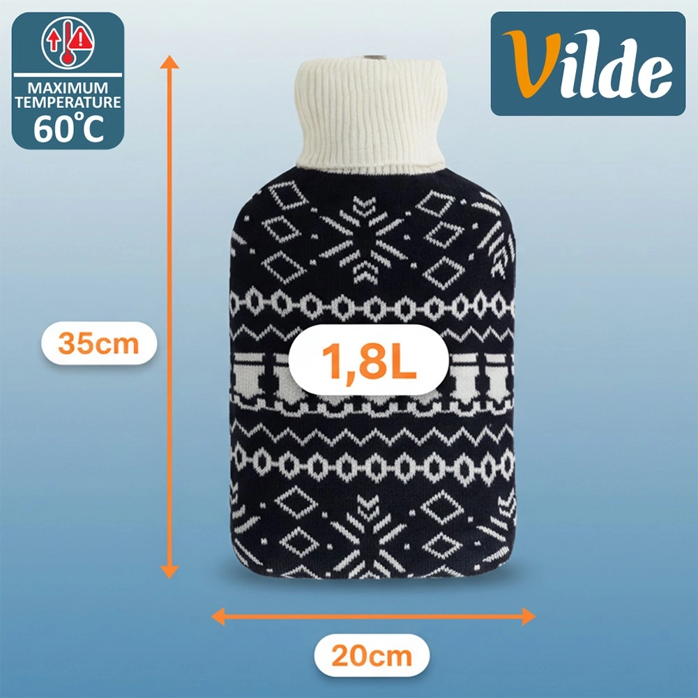 La bouillotte Vilde de 1,8 l est une aide fiable pour les soins quotidiens à la maison. Sa housse tricotée au motif nordique noir et blanc contrasté est agréable au toucher, améliore le confort et protège la peau de la chaleur directe. Grâce à la bouteille en caoutchouc de qualité et au bouchon à vis robuste, vous profitez d’une chaleur sûre et durable.