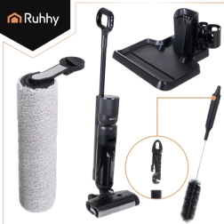 aspirateur laveur RUHHY Lixo, station de charge, support pour accessoires, brosse de nettoyage, rouleau rotatif, filtre HEPA, adaptateur secteur, manuel, carton de transport